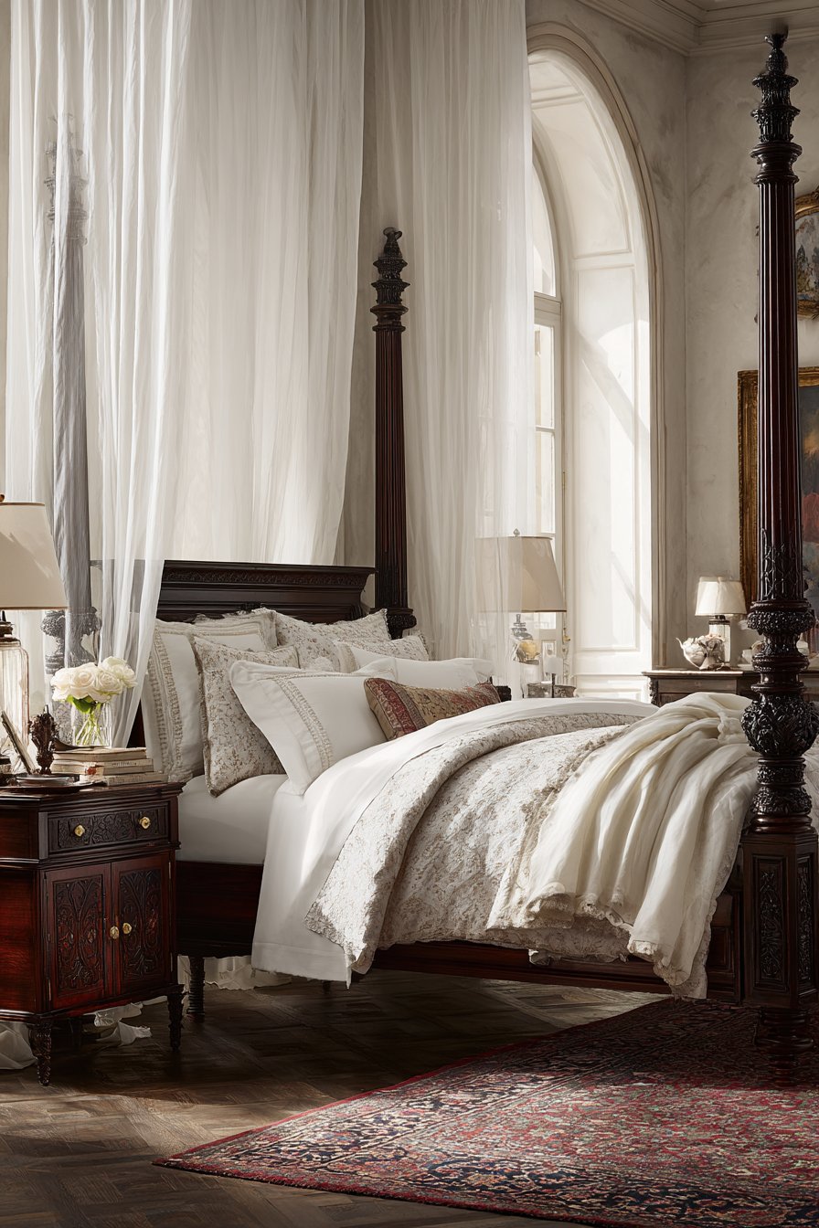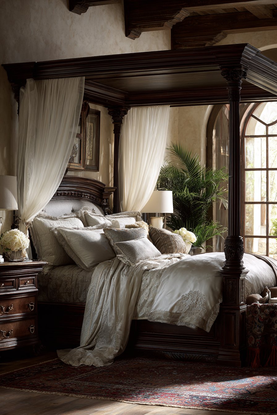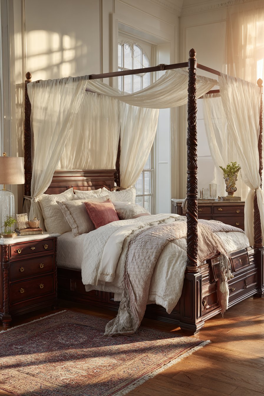 - Anchor four-poster beds with antique rugs in complementary colors