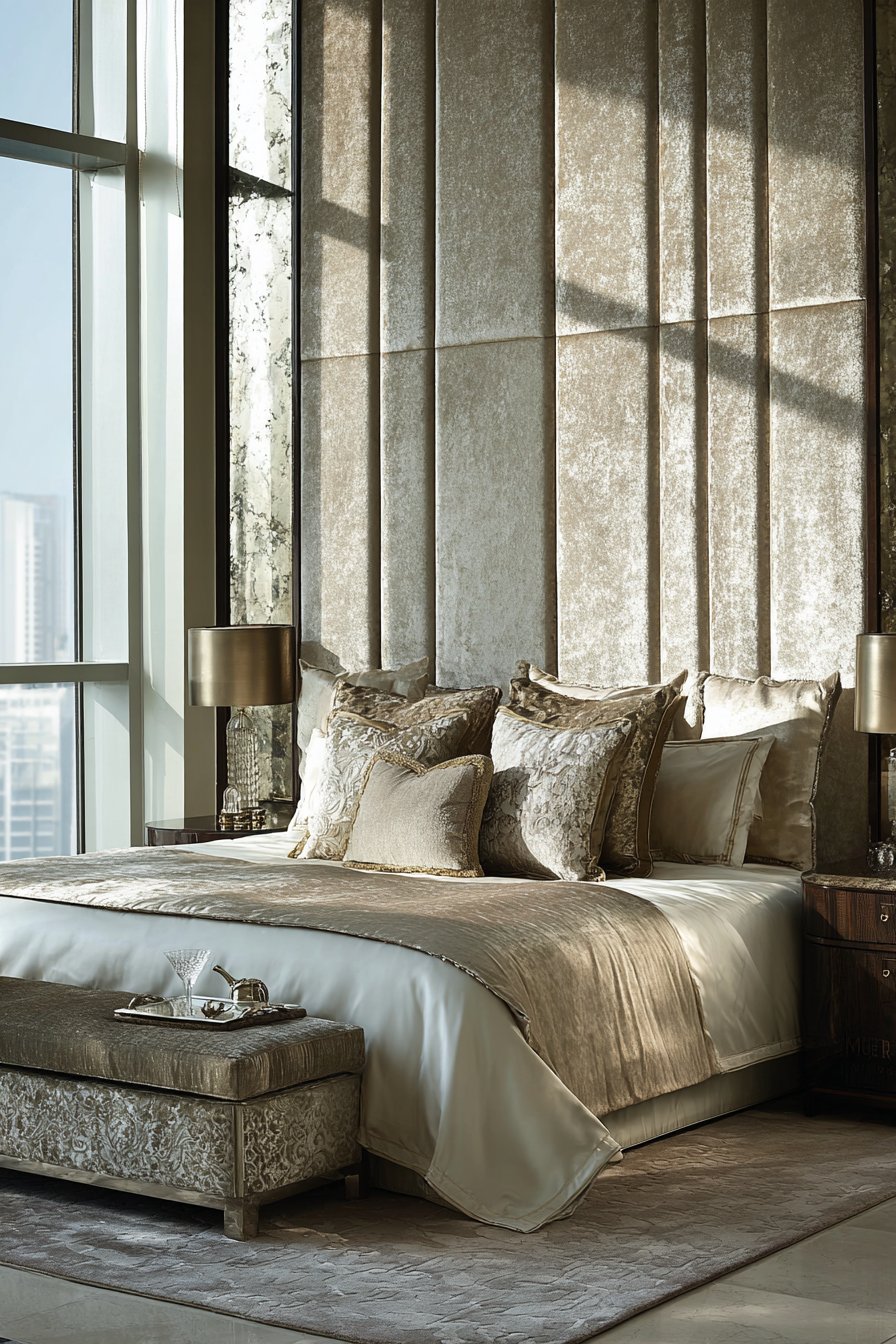 An extraordinary upholstered headboard creates focal wall. Champagne-colored silk features vertical channel tufting. The floor-to-ceiling treatment creates impressive verticality. Subtle metallic threading catches available light.