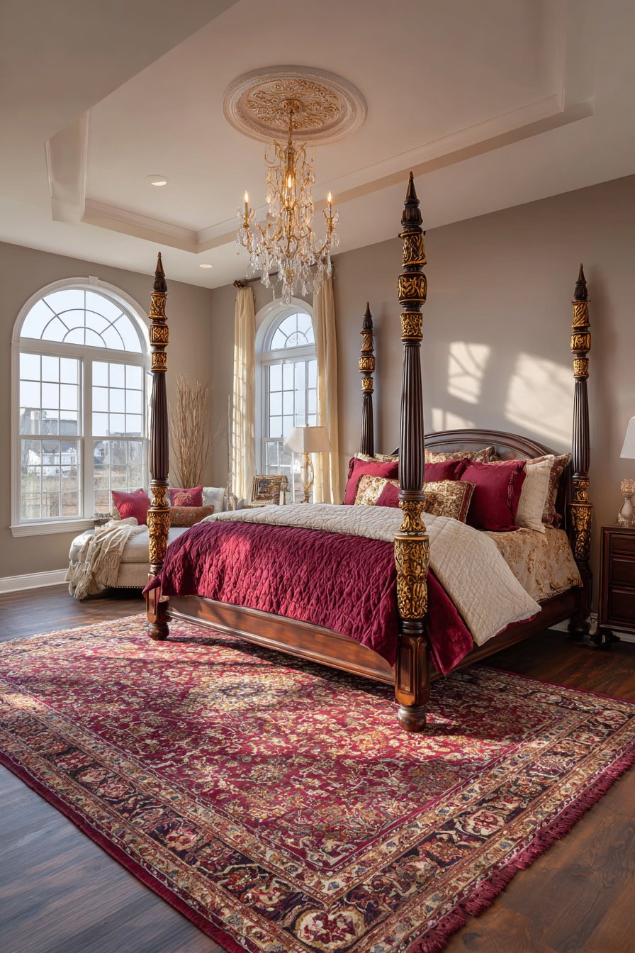 An antique Persian rug anchors the furniture arrangement. Deep burgundy and gold tones complement the bed’s rich wood finish. The rug’s traditional patterns add historical authenticity to the design. Its placement defines the intimate sleeping zone within the bedroom.