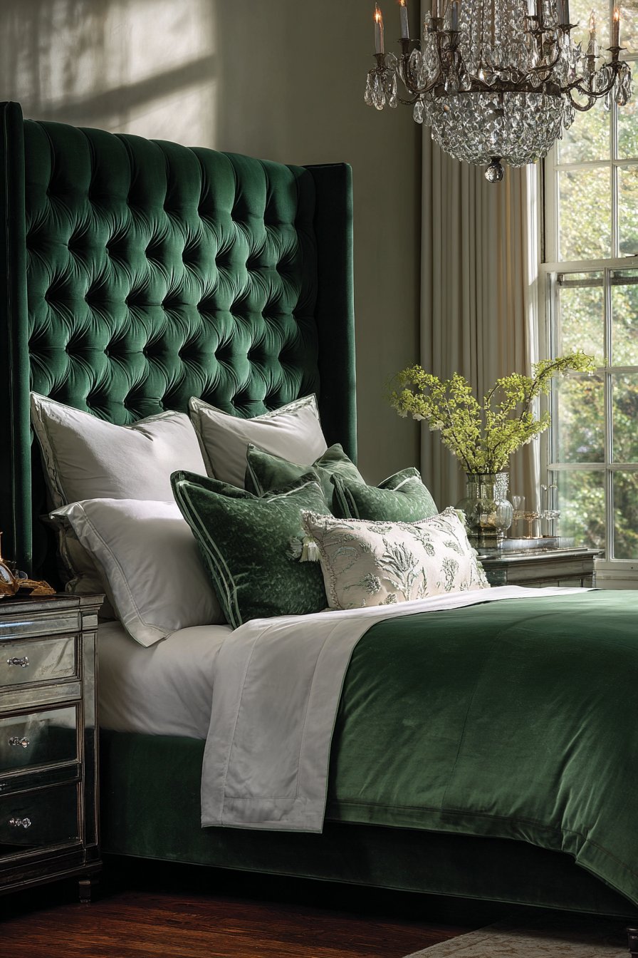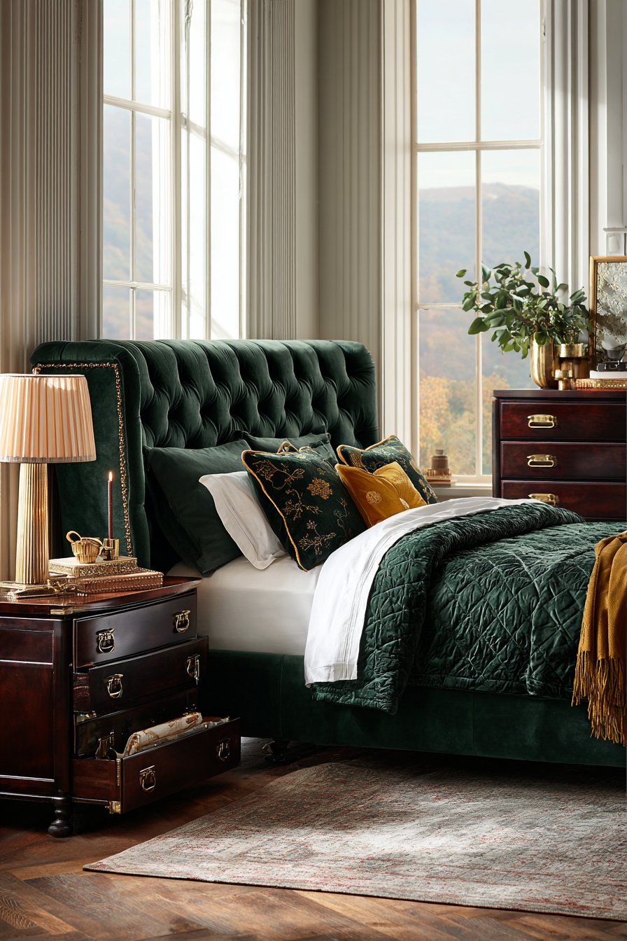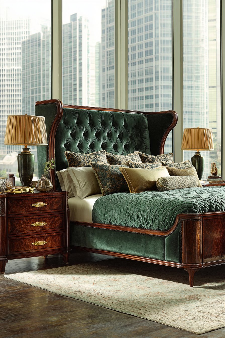A sophisticated bed features tufted wingback design. Deep forest green velvet creates rich color presence. Rolled arms extend from headboard sides. This architectural detail adds traditional refinement.