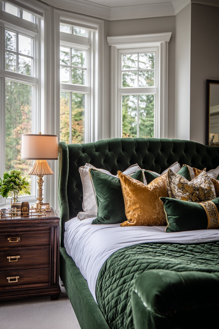 White Egyptian cotton linens provide essential contrast. A quilted velvet coverlet in matching green maintains continuity. Decorative pillows feature velvet, silk, and embroidered fabrics. Gold accents add warm metallic touches.