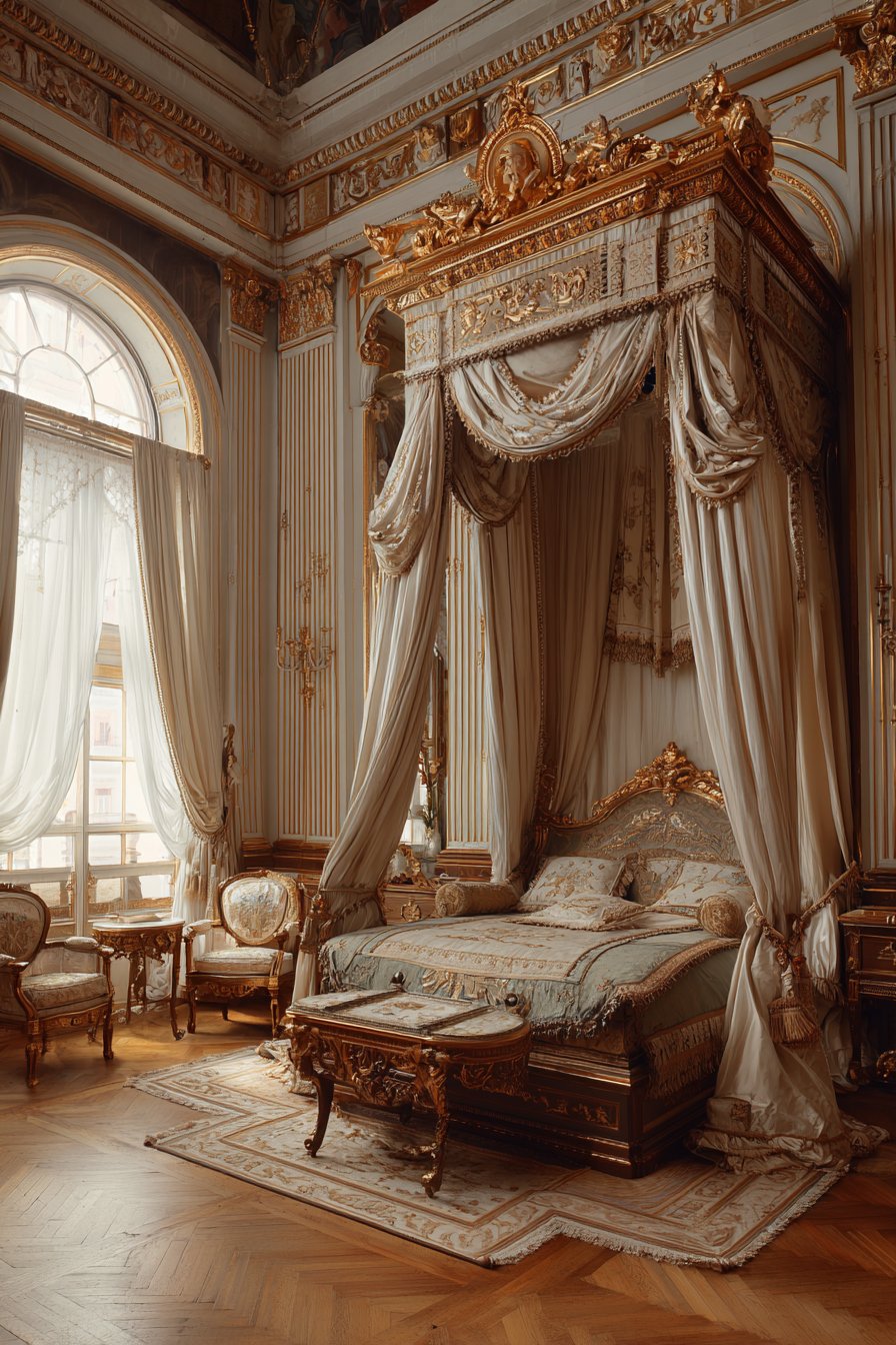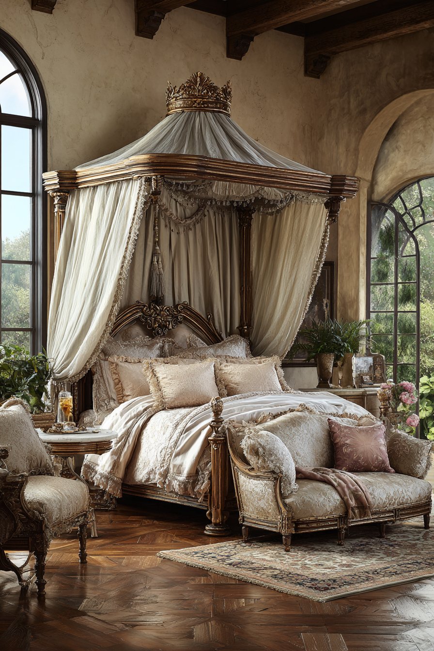 An elaborate canopy bed defines this romantic royal bedroom. Flowing silk drapery suspends from an ornate gilded crown. Ivory and pale gold fabrics create ethereal elegance. The crown’s intricate metalwork demonstrates exceptional craftsmanship.