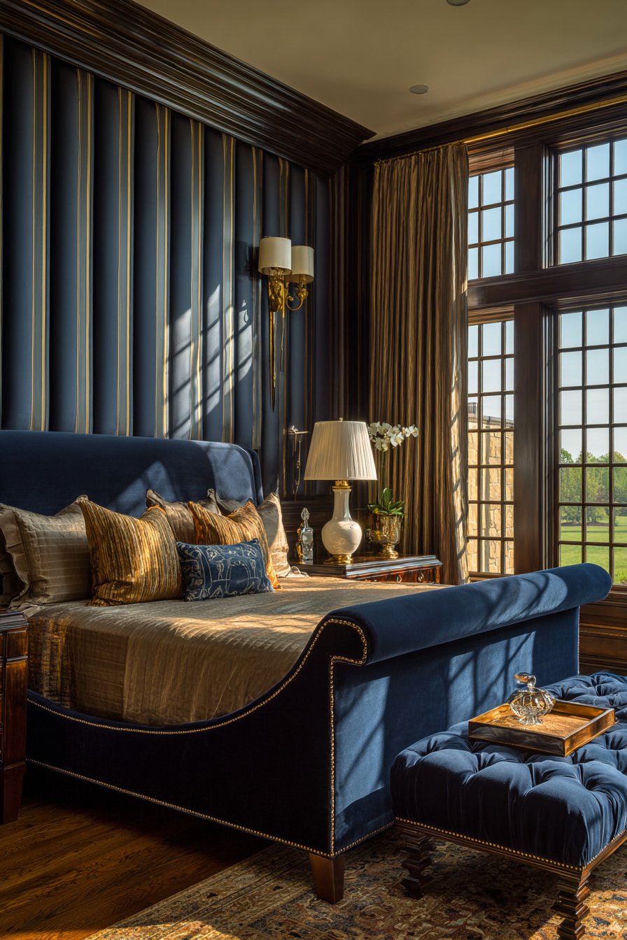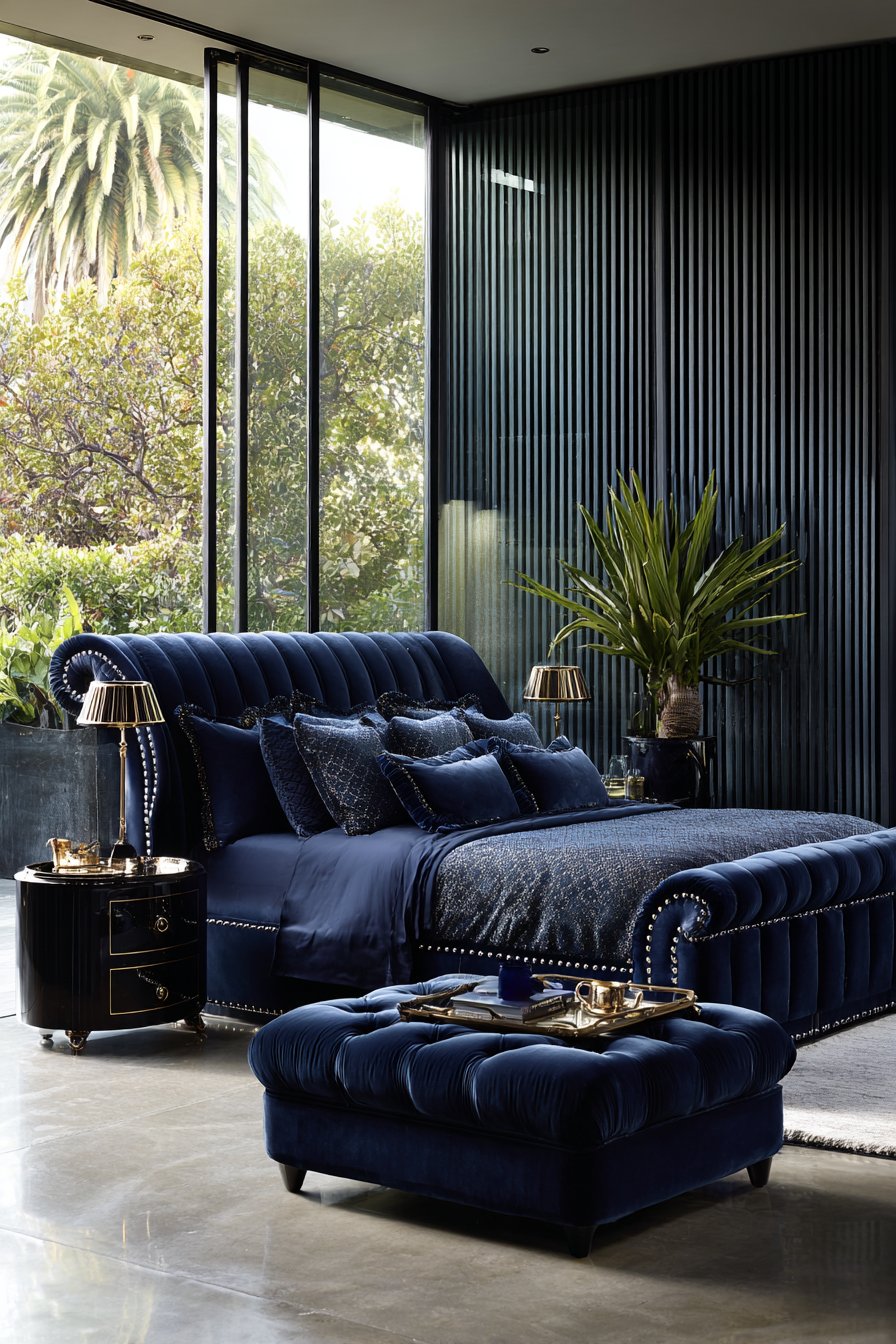 A massive upholstered sleigh bed anchors this dramatic bedroom. Deep navy velvet creates bold visual impact. Nailhead trim follows the bed’s curved lines precisely. The curved silhouette softens the bed’s substantial scale.