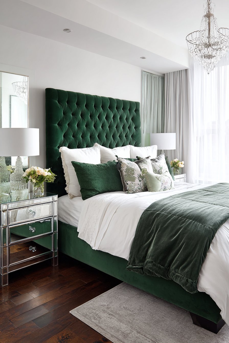 A dramatic upholstered bed features oversized dimensions. Emerald green velvet creates stunning visual impact. The tufted headboard extends to create a partial wall panel. This technique amplifies the bed’s presence dramatically.