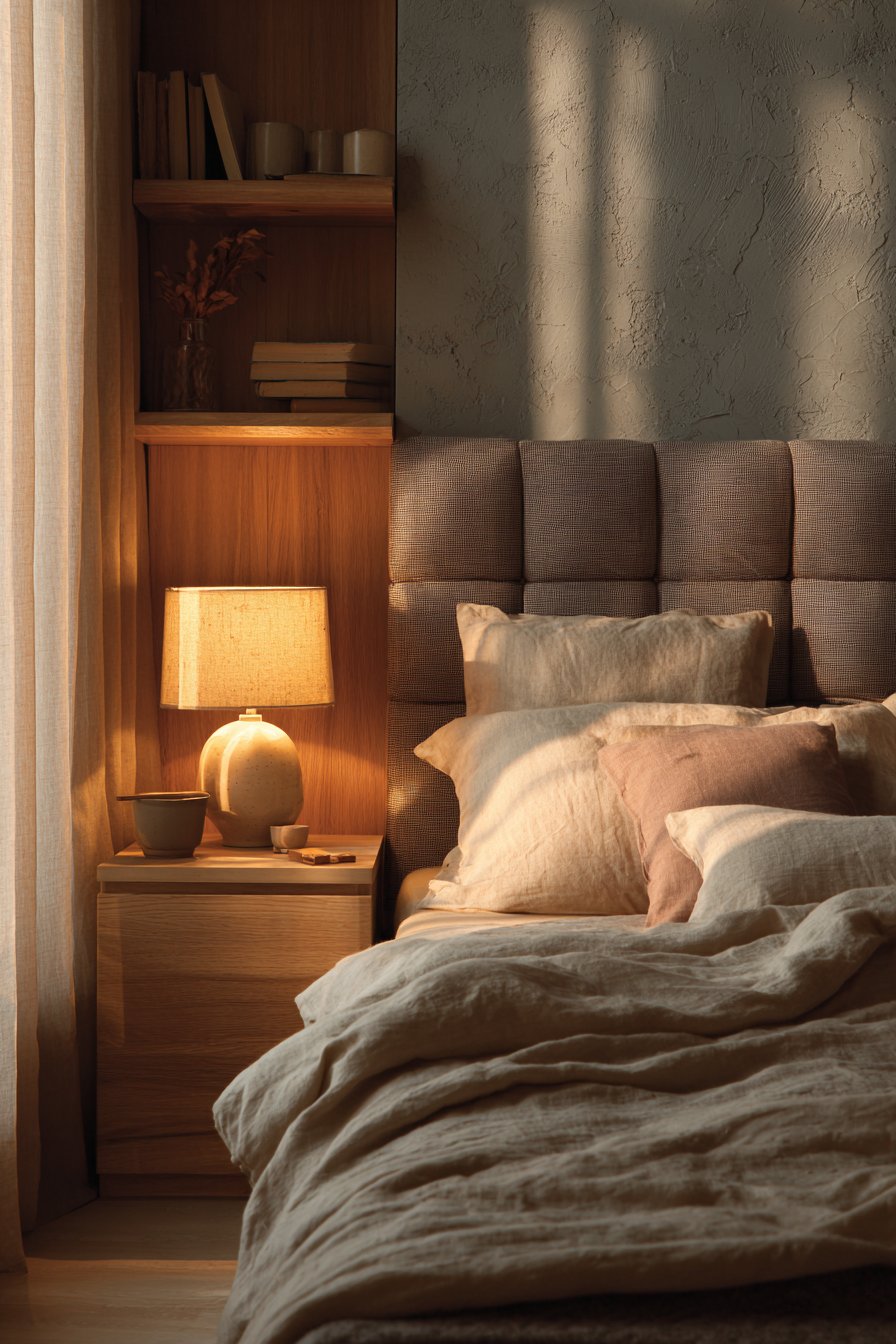 The color palette remains cohesive with warm neutrals and soft blush tones. This creates an enveloping atmosphere perfect for rest. The varied textures prevent the neutral scheme from feeling flat. Tufted fabric, smooth linen, and natural wood grain provide visual interest.