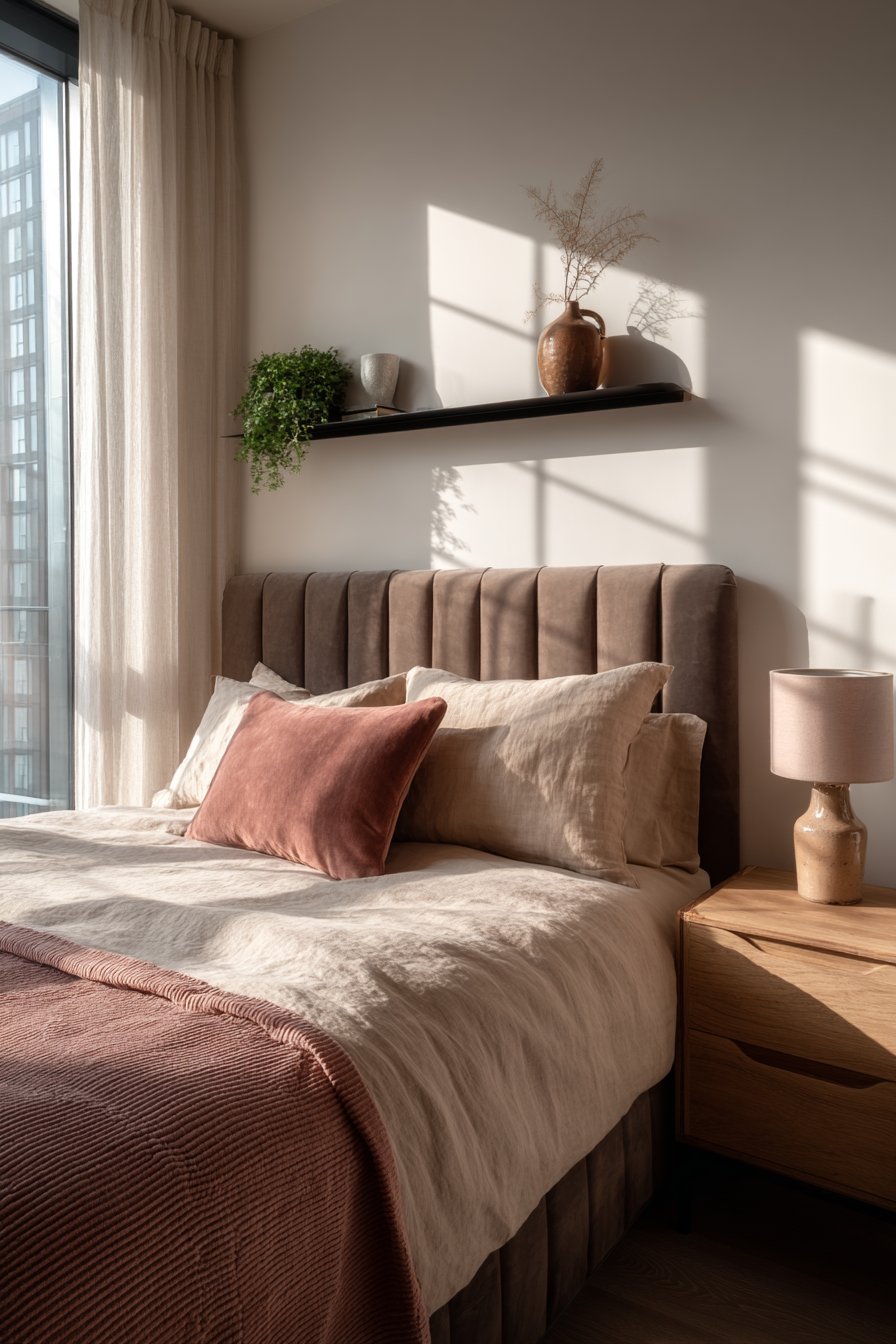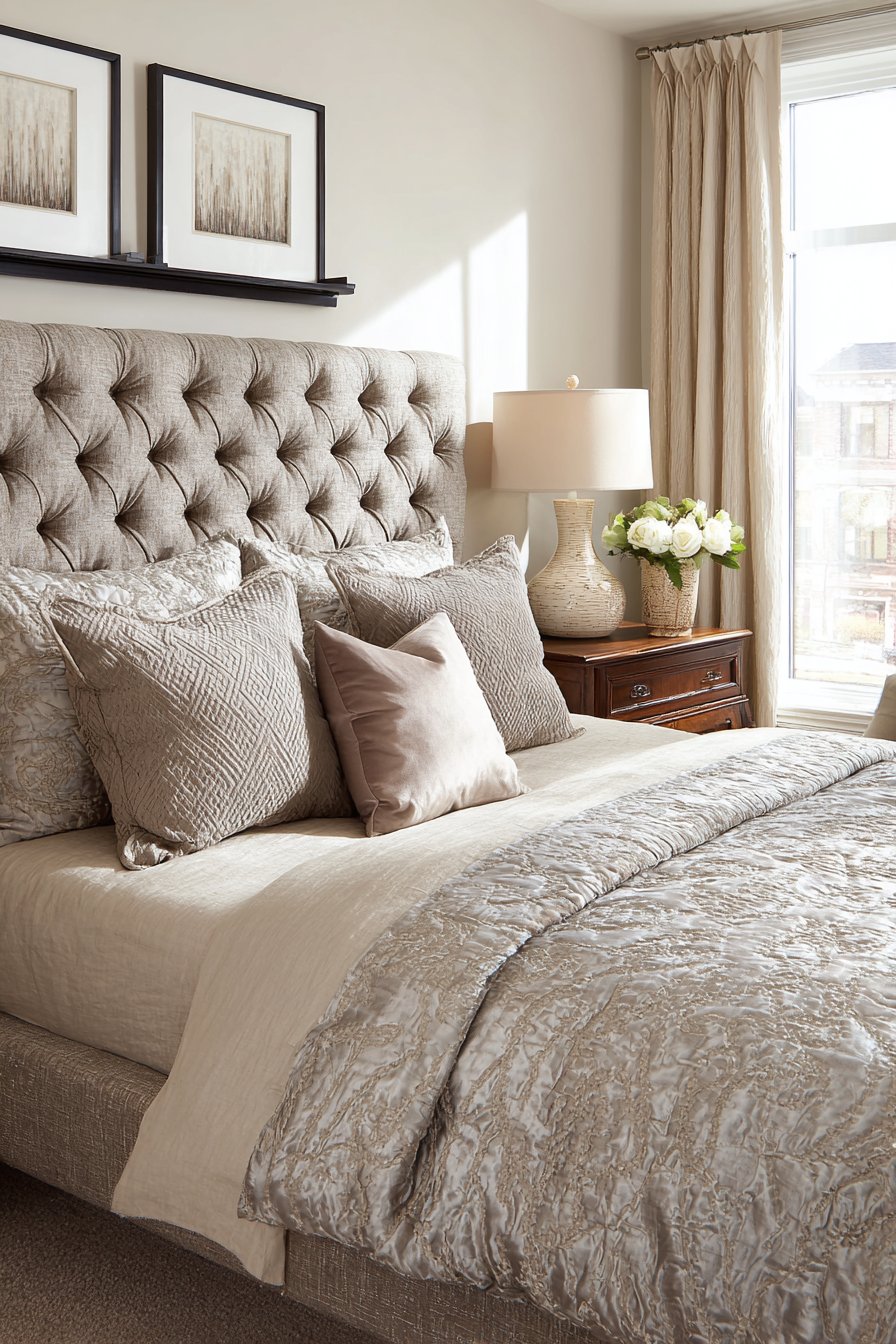 A plush upholstered platform bed anchors this small bedroom with sophisticated comfort. The tufted headboard in warm taupe fabric creates visual softness. Layers of cream and dusty rose linen bedding add depth. The tactile experience invites relaxation at every touch point.