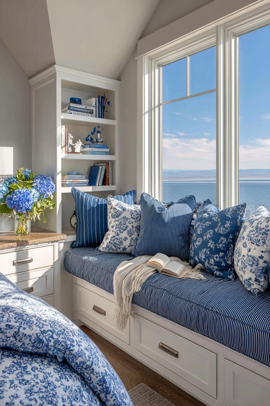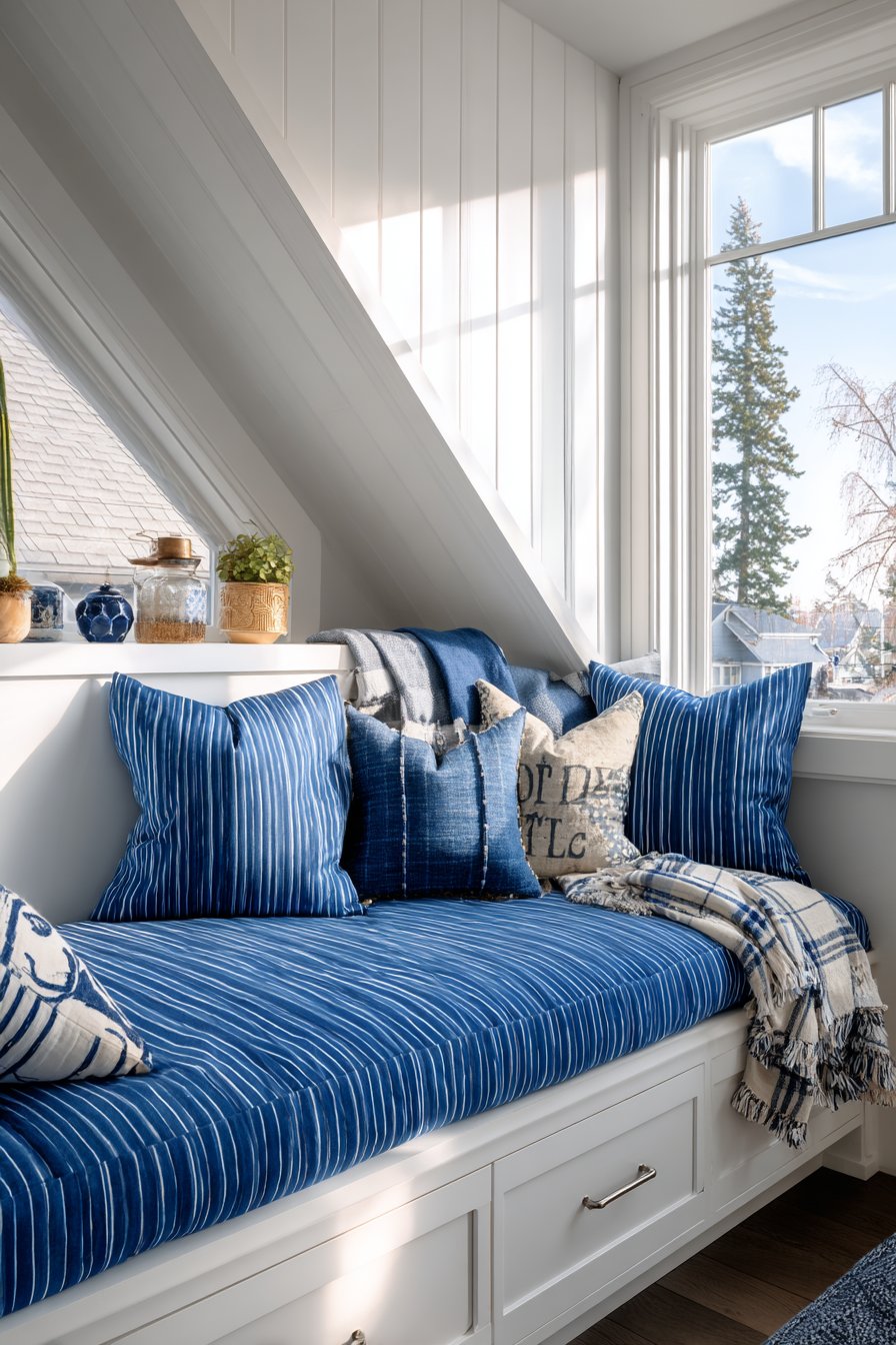 The window seat becomes a daytime retreat for reading. It transforms the bedroom into a multi-functional space. The coordinated blue tones create visual continuity. White stripes keep the pattern from overwhelming the small room.