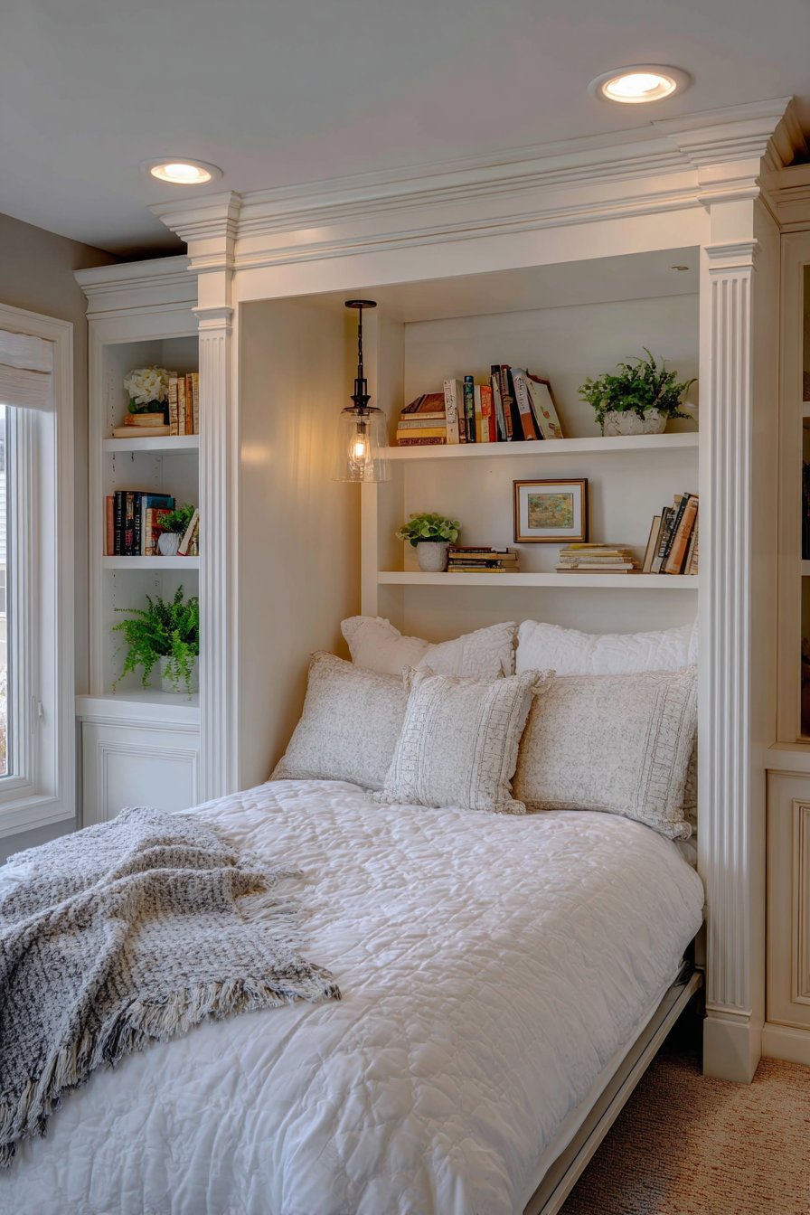 Simple white bedding with a gray wool throw maintains focus. The built-in design eliminates the need for separate furniture. Small decorative objects and a potted succulent personalize the nightstands. The seamless integration looks professionally designed.