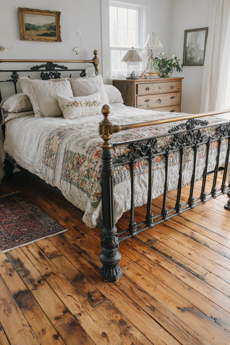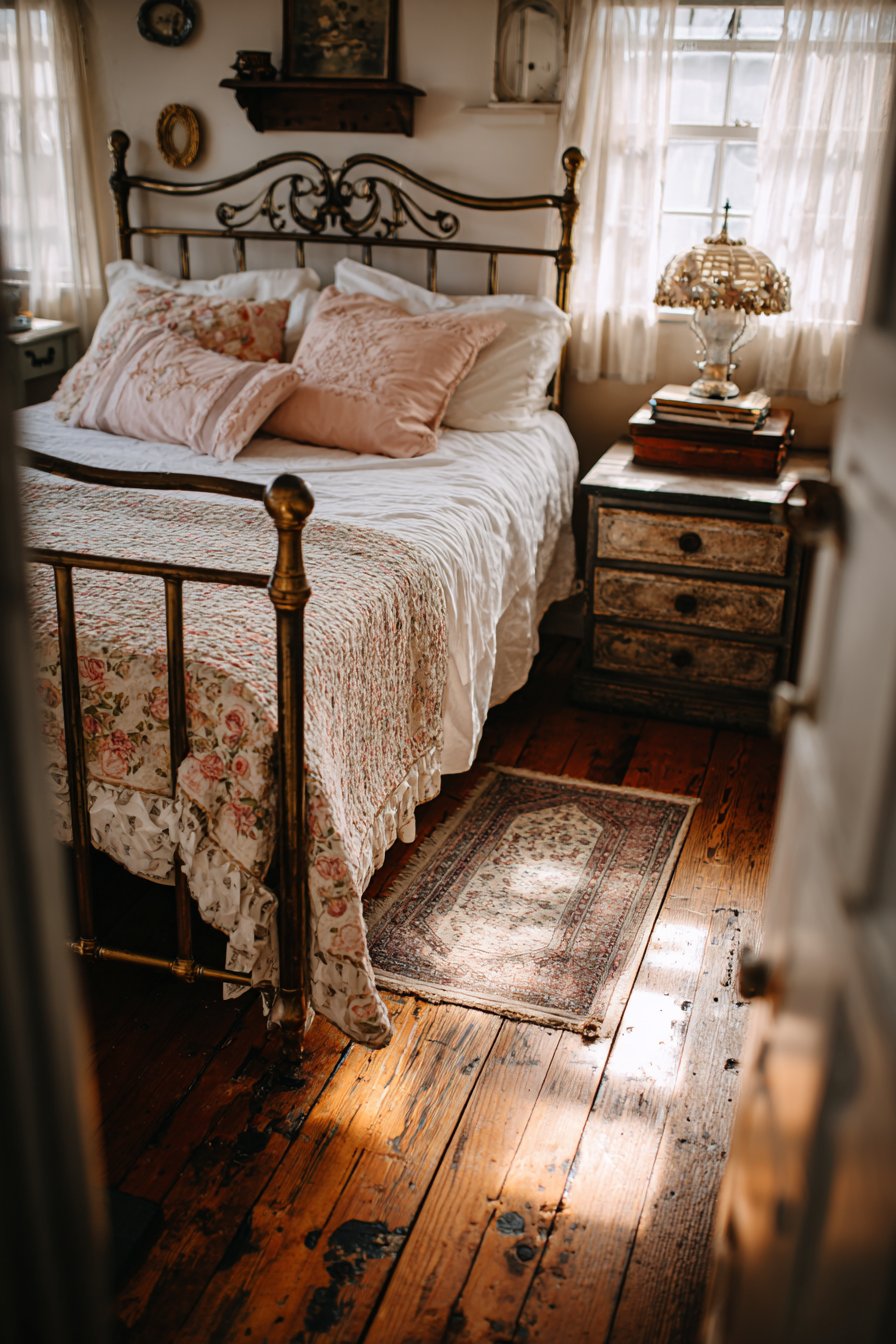 A vintage brass bed frame with ornate details anchors the room. The metal’s patina shows authentic age and character. An antique patchwork quilt provides colorful textile history. Linen sheets and embroidered pillows layer additional softness.