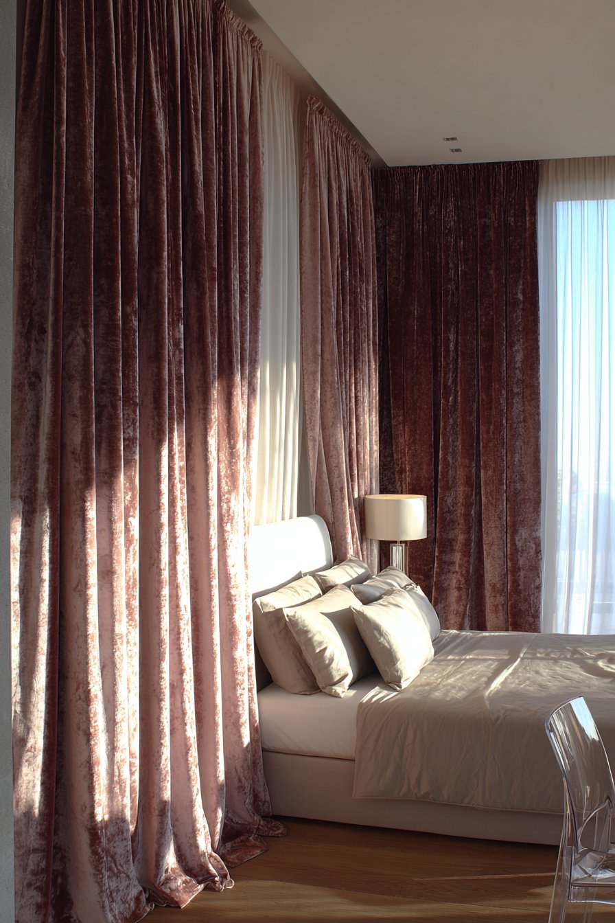 The velvet’s rich texture adds sophisticated luxury. The vertical lines draw eyes upward dramatically. The blush color remains soft without being overtly feminine. Natural and artificial light interact with the fabric gorgeously.
