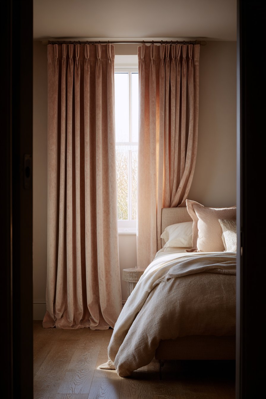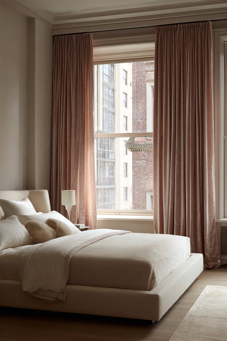 Floor-to-ceiling curtains in soft blush pink velvet frame the window. The luxurious fabric pools slightly on hardwood floors. This creates an illusion of much higher ceilings. The simple platform bed allows the curtains to star.