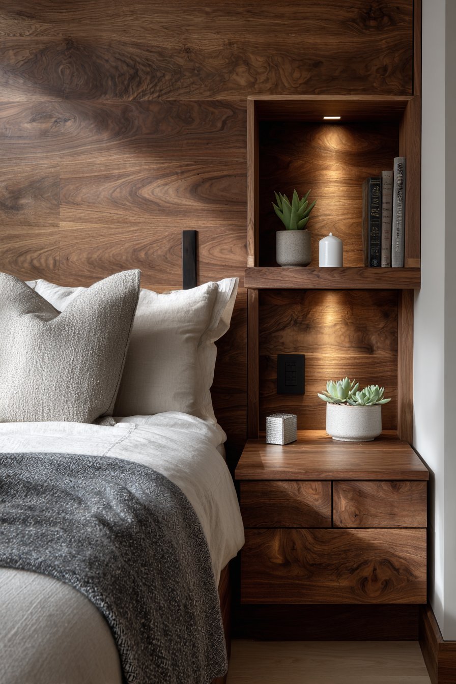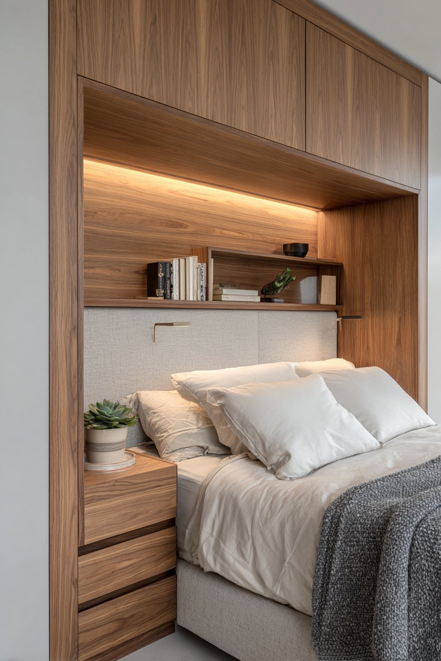 A built-in headboard wall features integrated floating nightstands. Recessed reading lights are incorporated seamlessly. The warm walnut veneer shows beautiful visible grain. The custom look maximizes limited space intelligently.