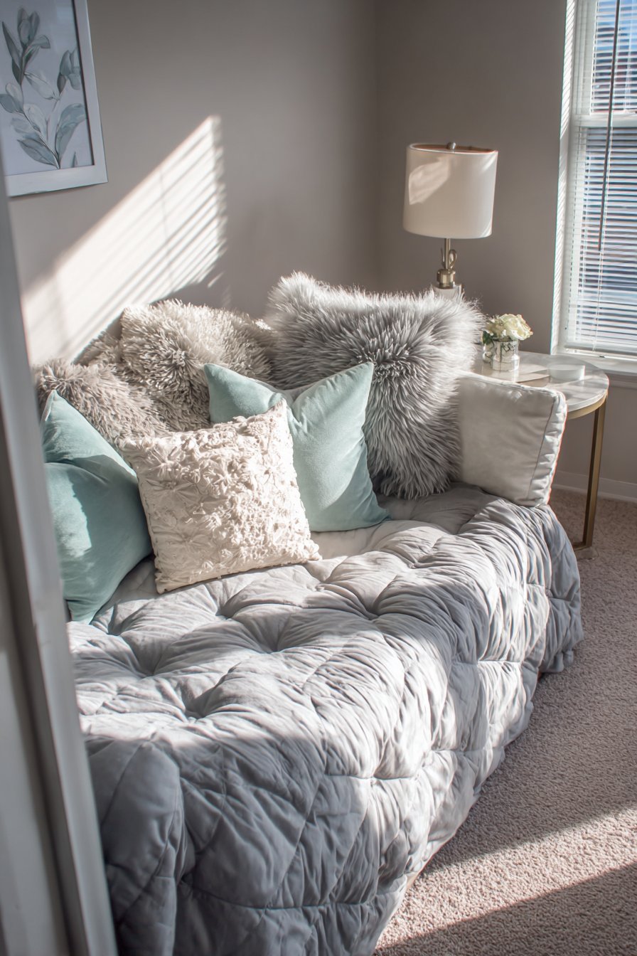 The layered pillows add comfort and visual interest. Different textures prevent the neutral palette from feeling flat. The easily removable coverlet allows quick transformation. The space adapts to different needs throughout the day.