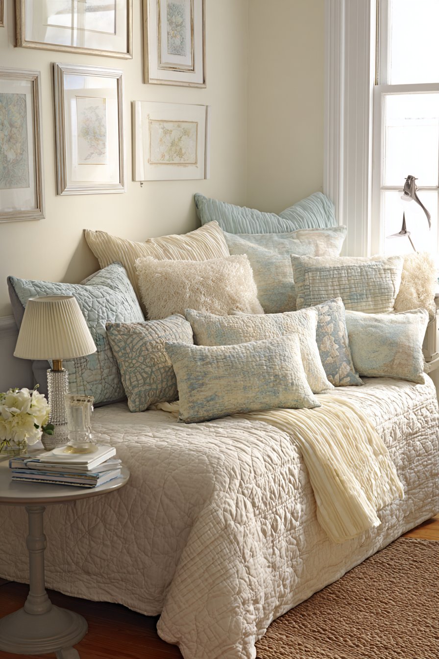 - Layer multiple quilts and pillows for texture and comfort