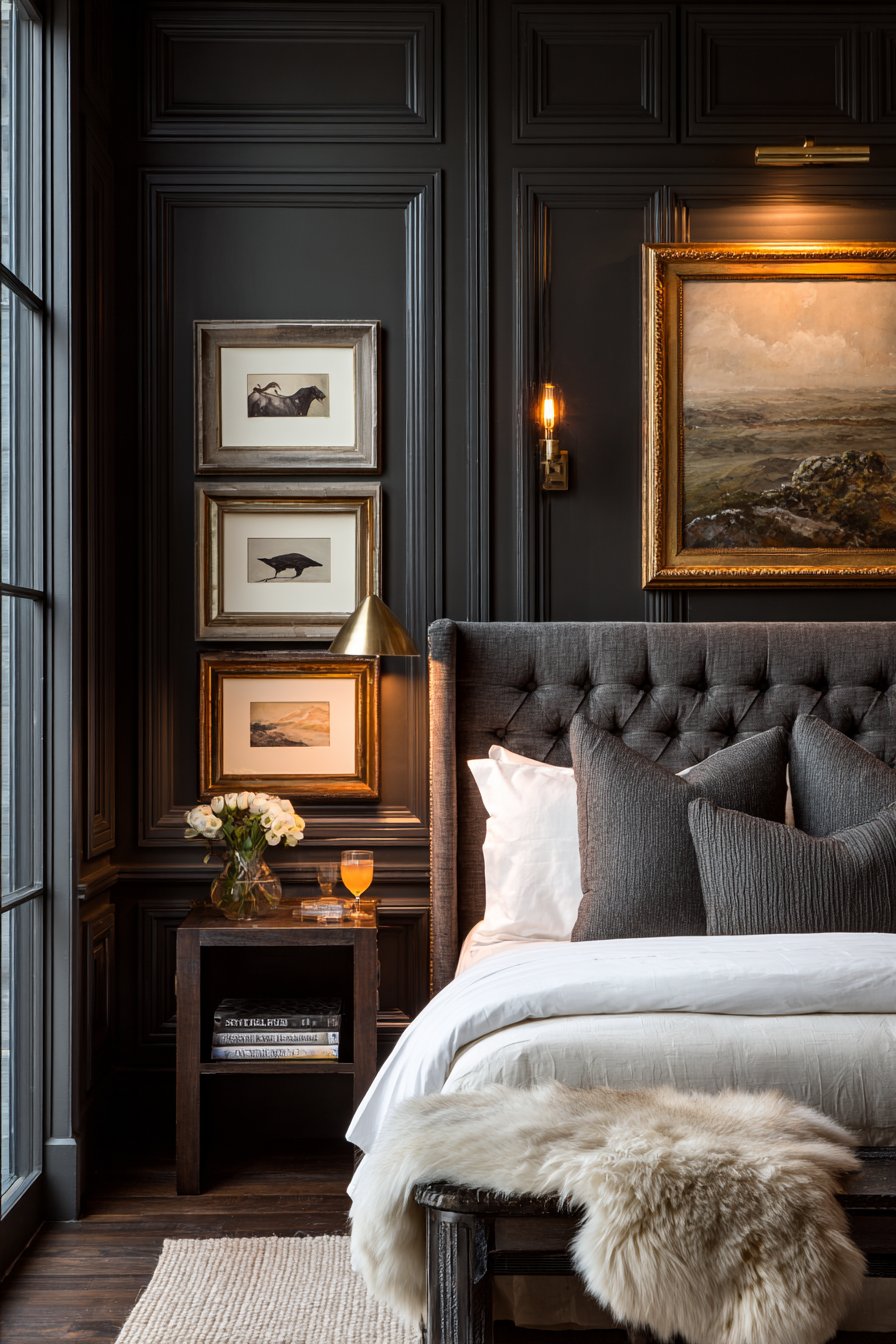 Brass picture lights above framed artwork add warm accents. The metallic glow contrasts beautifully with dark walls. A sheepskin rug beside the bed adds tactile warmth. Carefully balanced lighting ensures the room doesn’t feel cave-like.