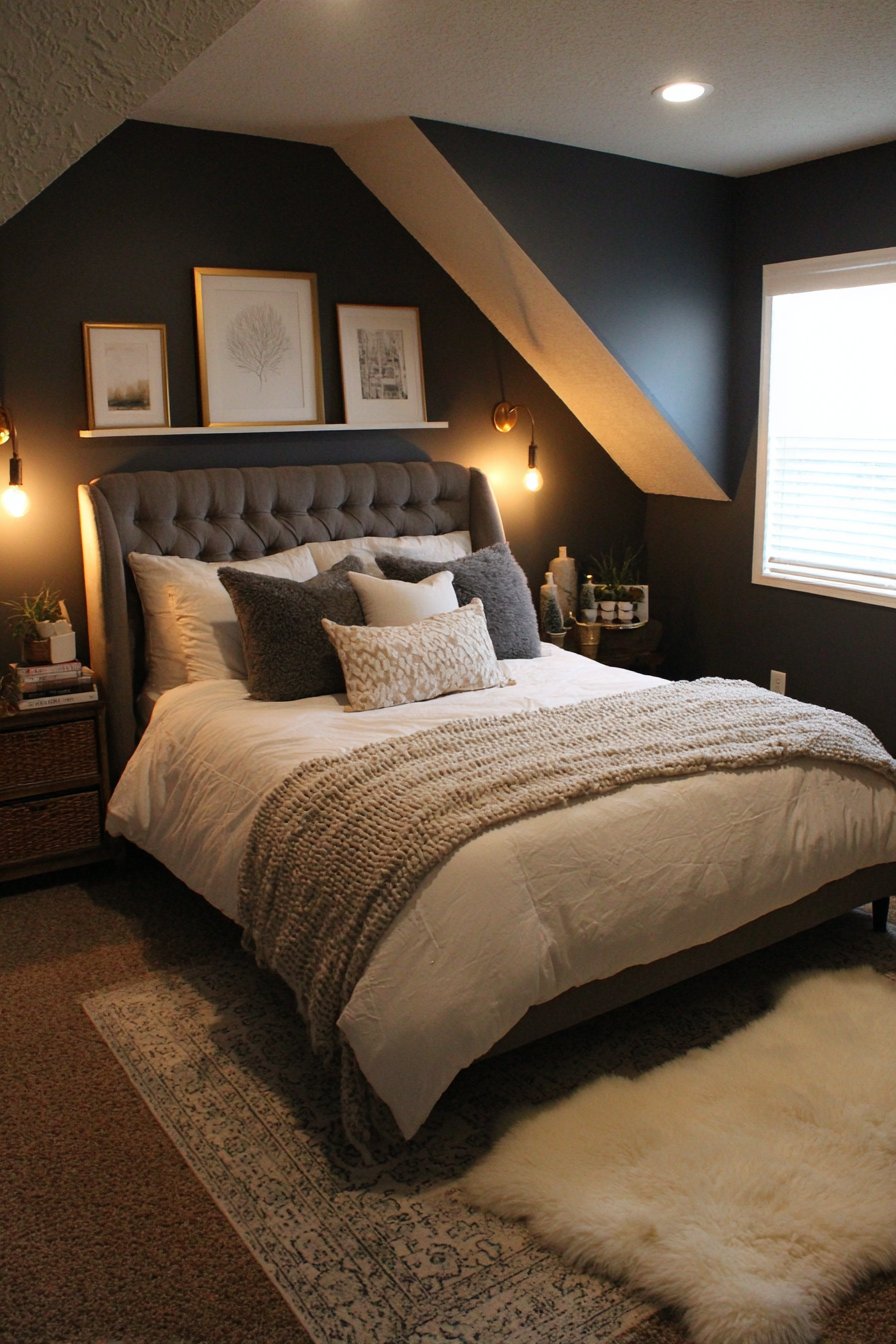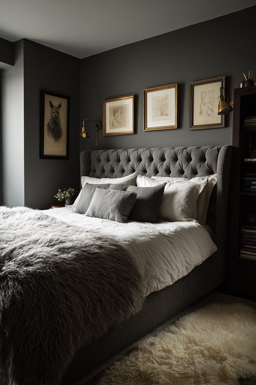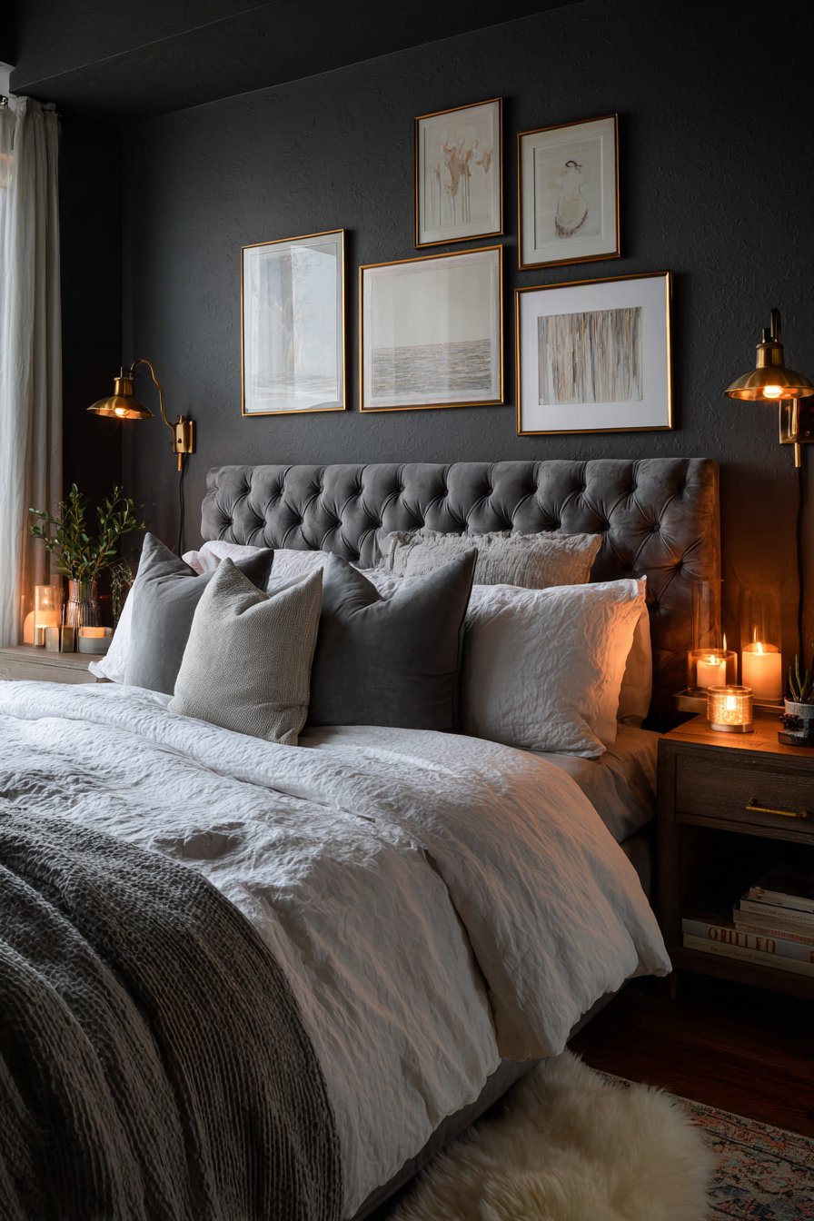 Dark charcoal gray walls create a cocoon-like embrace. The intimate atmosphere works perfectly in small spaces. A tufted headboard in dove gray velvet provides textural contrast. Crisp white bedding and varied gray pillows create layers.