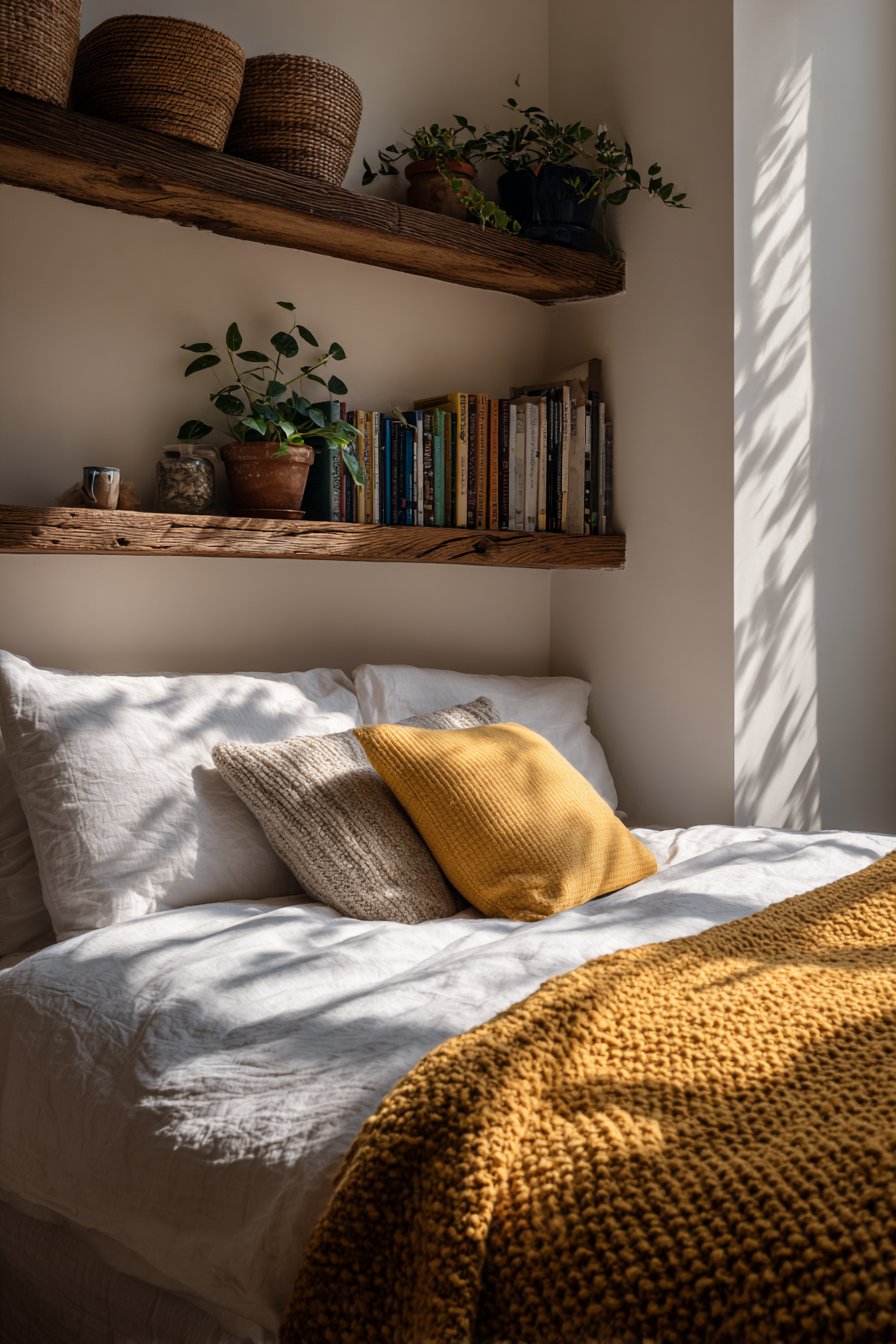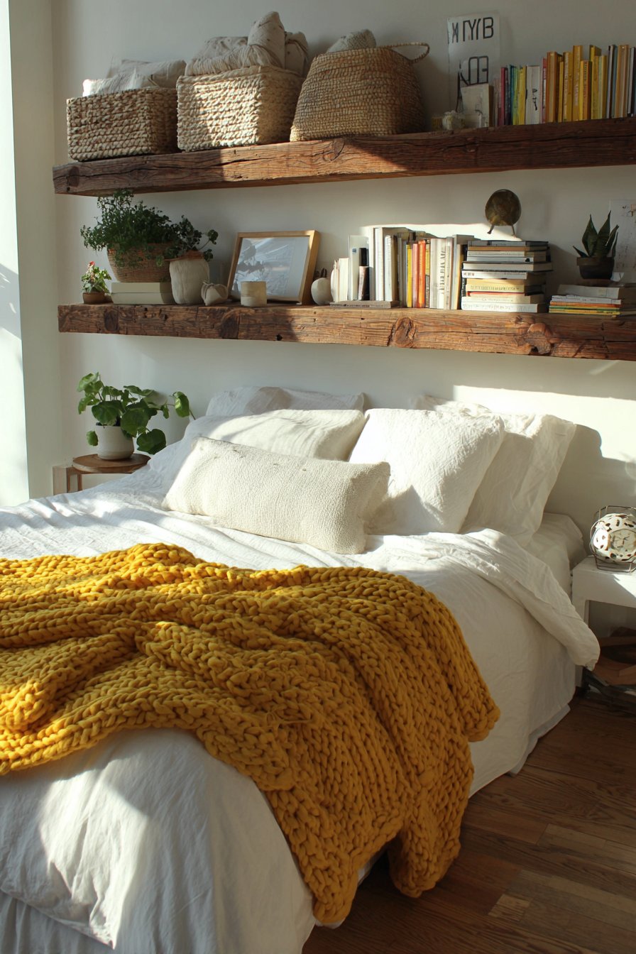 The reclaimed wood shelves show visible knots and grain. This adds rustic warmth and authentic character. Simple white bedding and a chunky knit throw in mustard yellow provide contrast. Potted plants on shelves add life and softness.