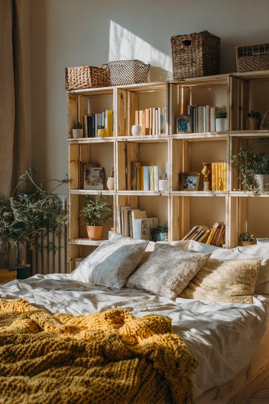 Open shelving above the bed displays curated storage solutions. Woven baskets provide concealed organization beautifully. Books arranged by color create visual interest. Small decorative objects add personality and charm.