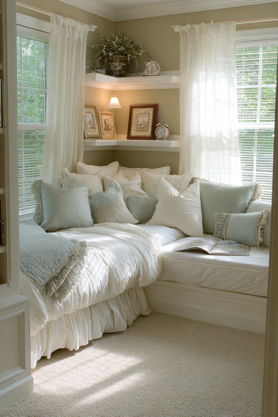 Corner bed placement maximizes usable floor space brilliantly. The L-shape arrangement creates a protected sleeping area. Pillows arranged along both walls create daybed effect. Layers of white and sage green cotton feel soft.
