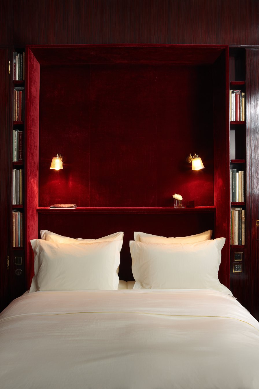 Brass wall sconces mount directly to the headboard panels. They provide a reading light without requiring table lamps. Warm evening light creates highlights on the velvet’s pile. The sumptuous texture becomes even more apparent.