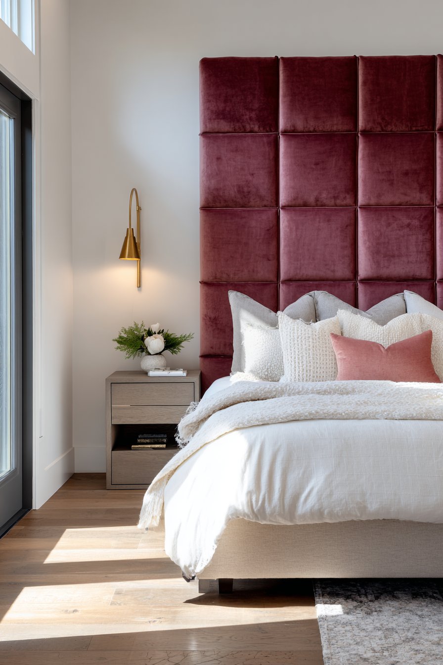 A statement upholstered headboard in rich burgundy velvet commands attention. It extends nearly wall-to-wall, creating dramatic impact. Integrated side panels include small shelves for necessities. Simple white and cream bedding allows the headboard to shine.