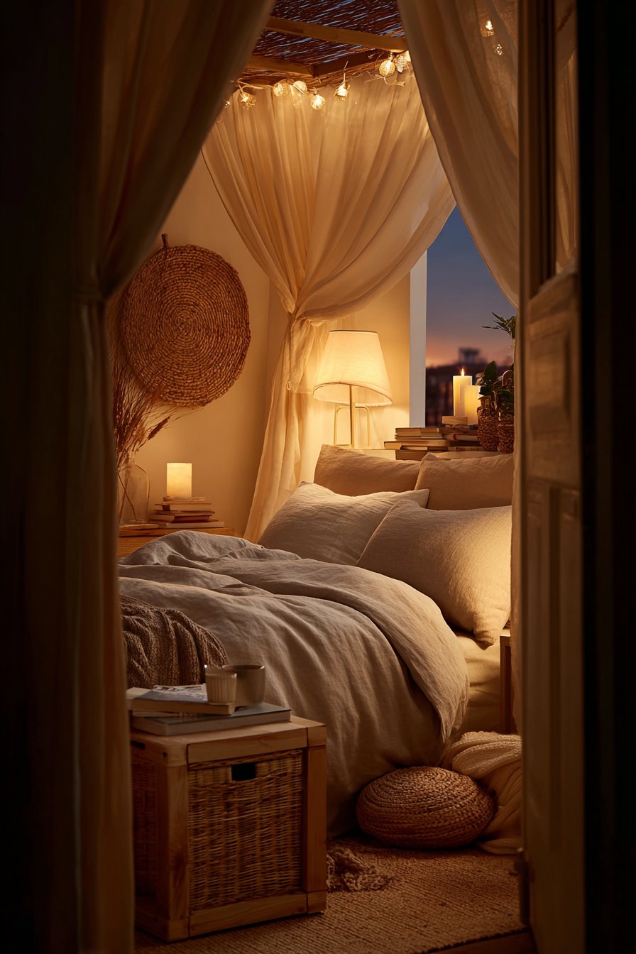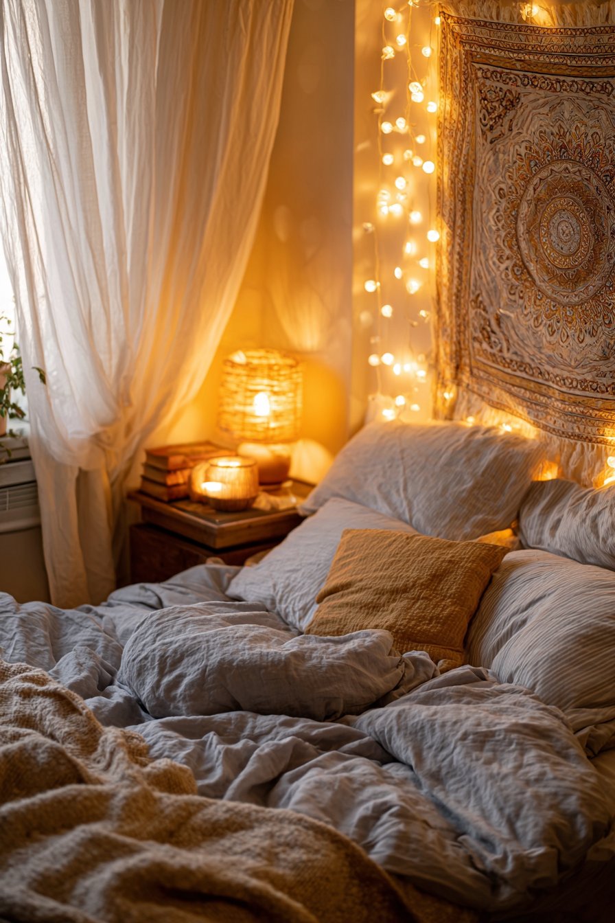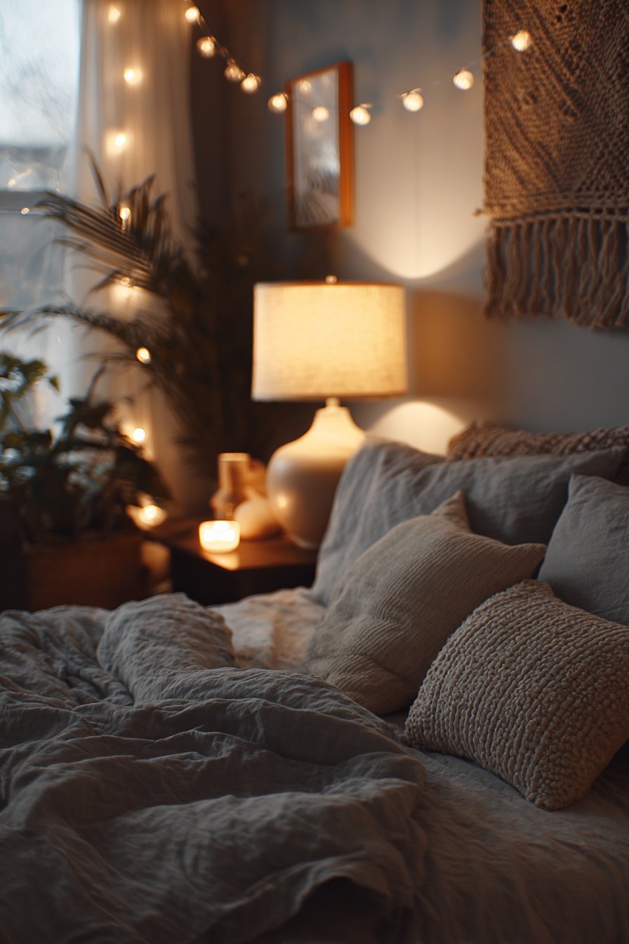 Rumpled linen bedding in soft gray suggests lived-in comfort. A woven wall hanging adds texture without floor space. Warm incandescent bulbs create golden glow at dusk. Multiple light sources at different heights add depth.