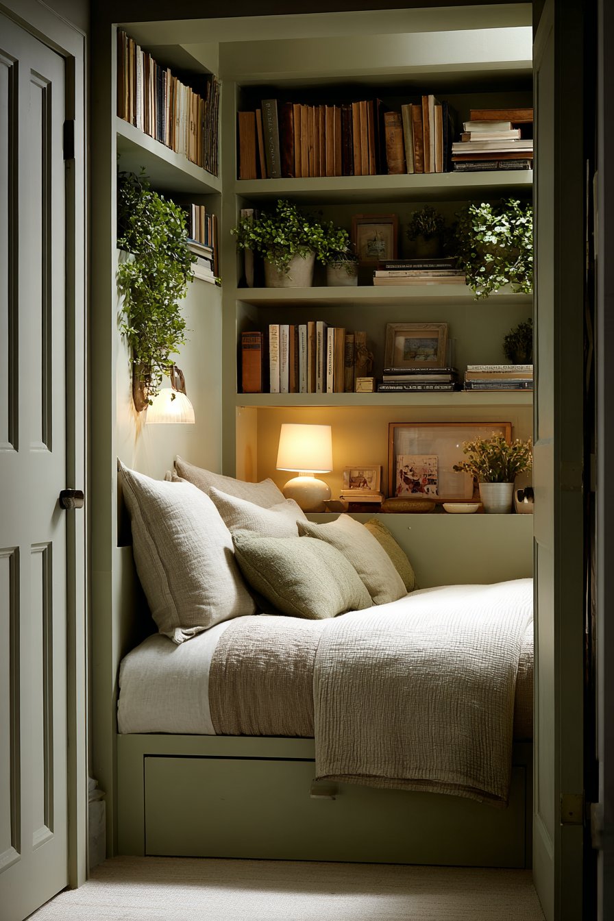Built-in shelving flanking the bed demonstrates smart spatial planning. The shelves are painted soft sage green matching the walls. This creates a cohesive, custom appearance throughout the room. Books, potted plants, and photographs personalize the storage displays.