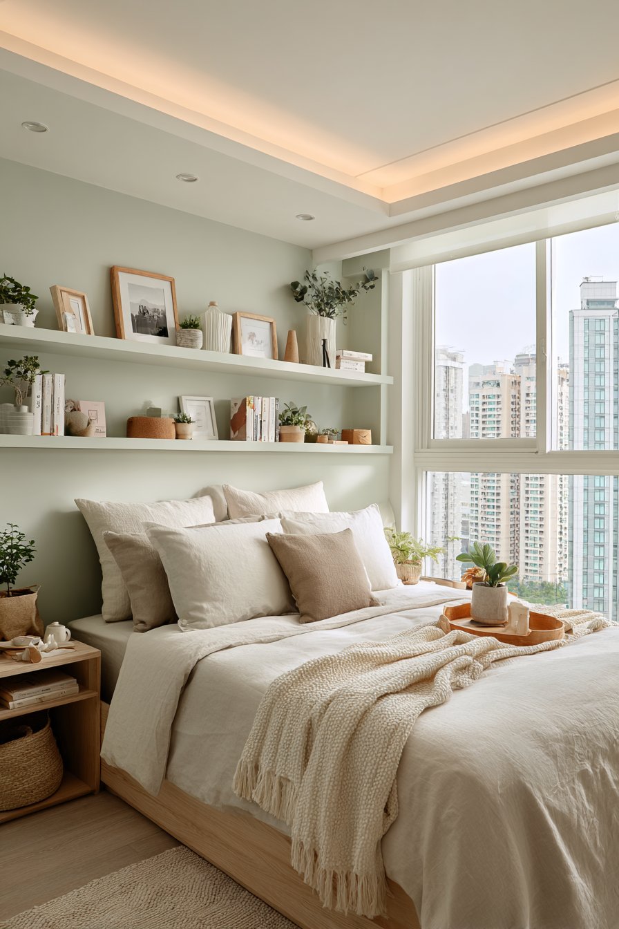 The sage green accent color adds freshness to white. The floating shelf maximizes corner space perfectly. The sheer curtains maintain privacy while welcoming light. The nest-like arrangement promotes restful sleep.