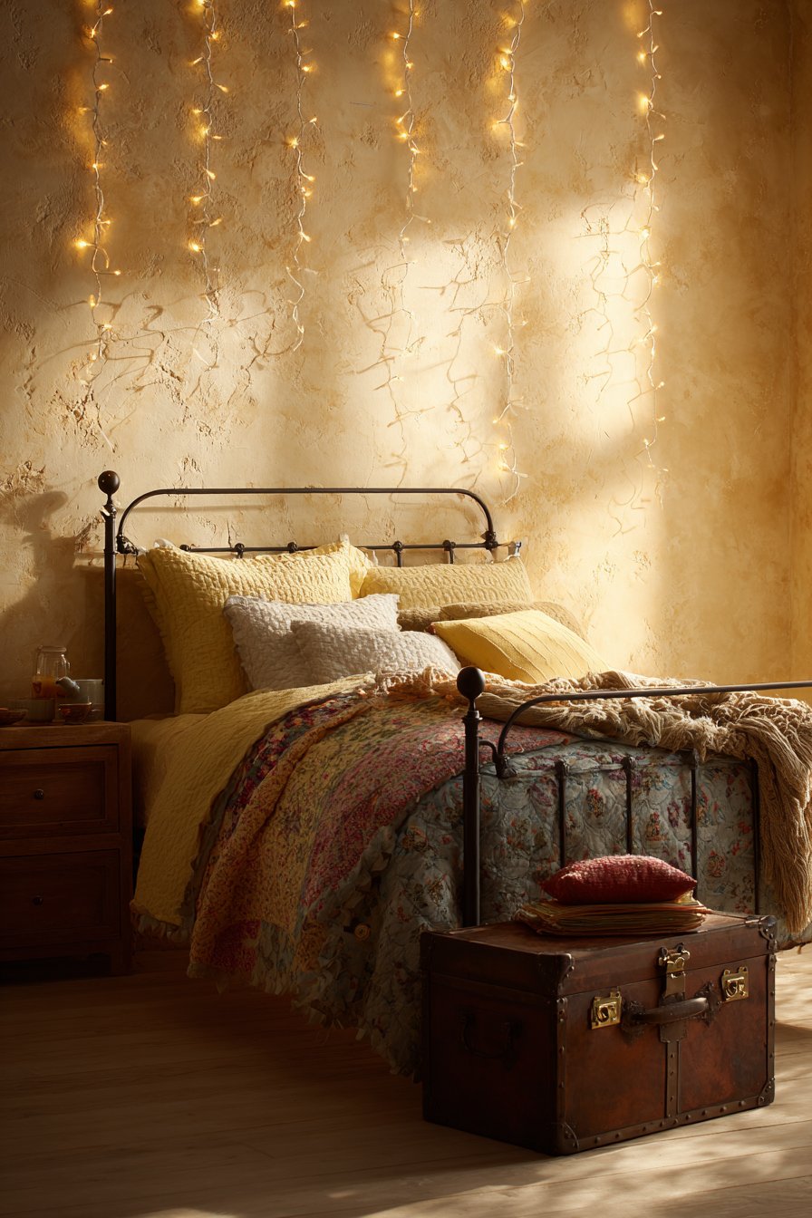 Layered quilts and multiple pillows create sumptuous comfort. The warm color palette flows from walls through textiles seamlessly. String lights draped along the headboard add romantic illumination. This soft lighting transforms evenings into magical experiences.