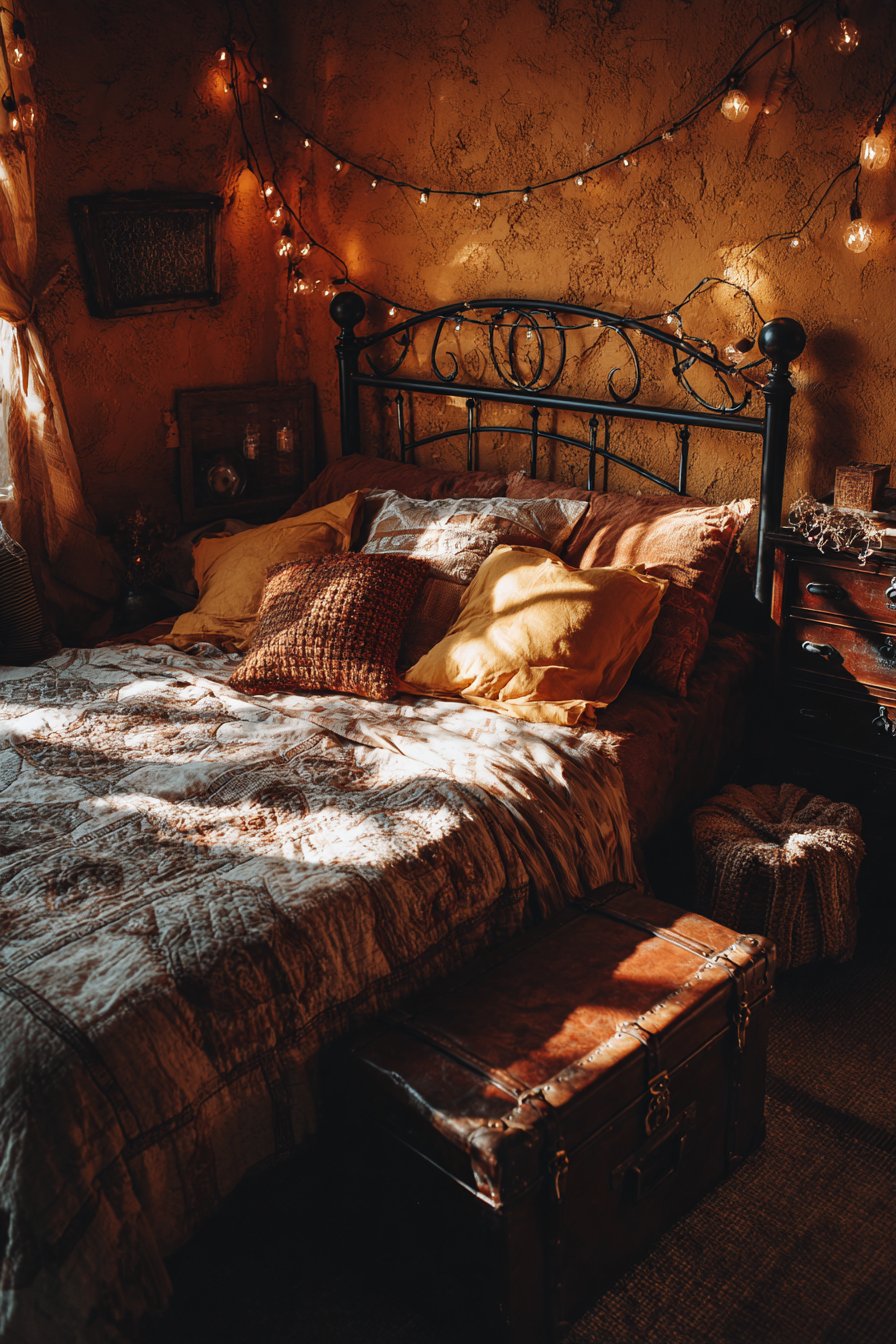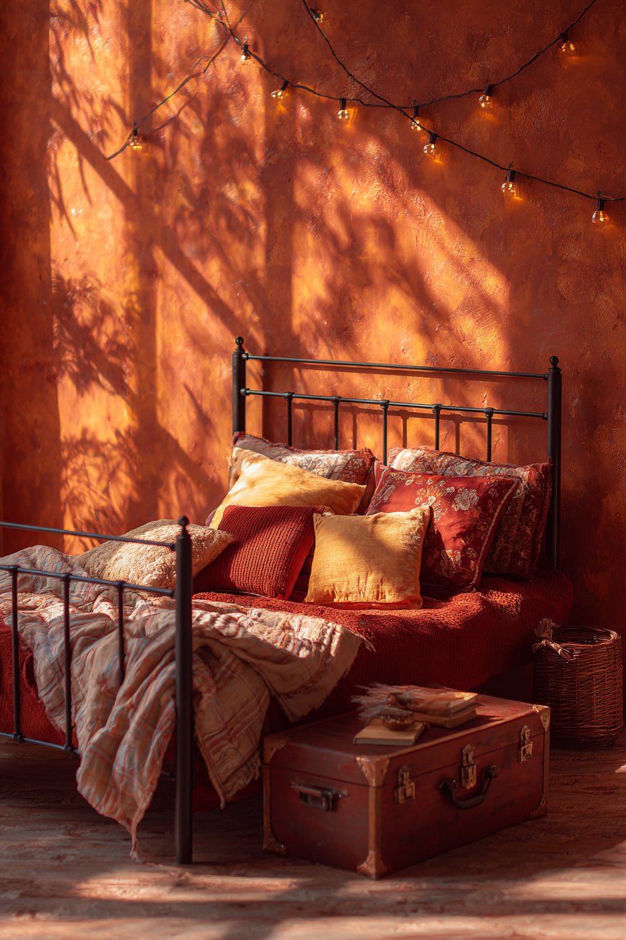 A small vintage trunk at the bed’s foot solves multiple needs. It provides essential storage while enhancing the aesthetic. Golden hour sunlight casts amber tones across textured surfaces. The warm light intensifies the terracotta walls beautifully.