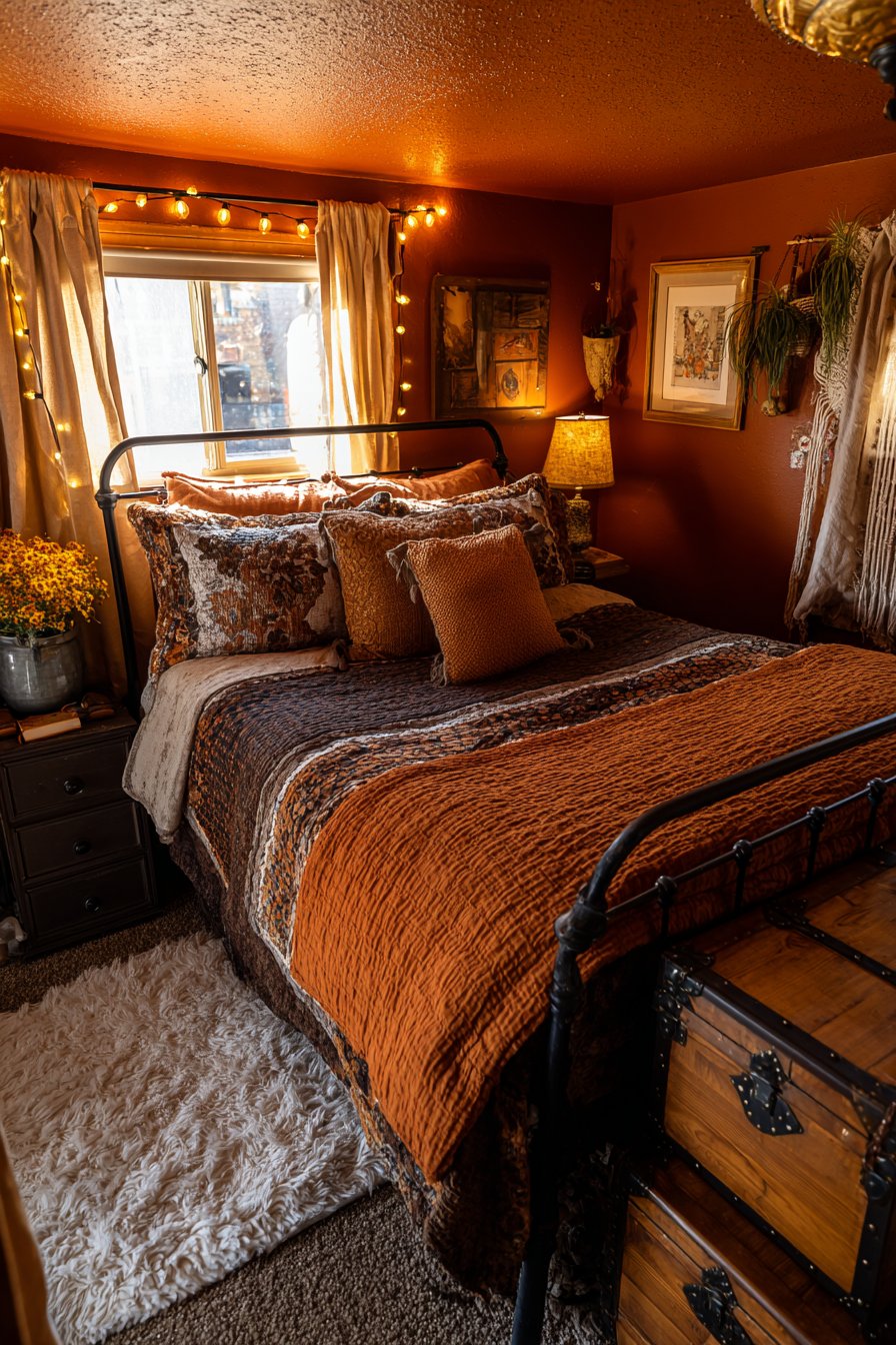 Warm terracotta walls create an immediate sense of embrace. The bold color choice makes small spaces feel intentionally intimate. A wrought iron bed frame in matte black provides striking contrast. The vintage-inspired design adds timeless character and visual weight.
