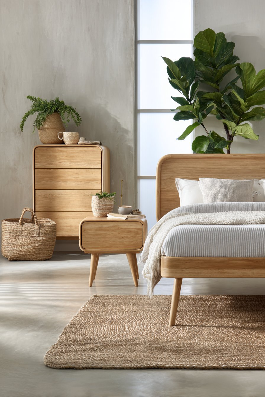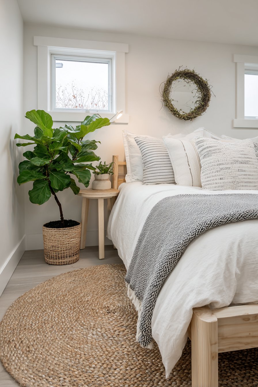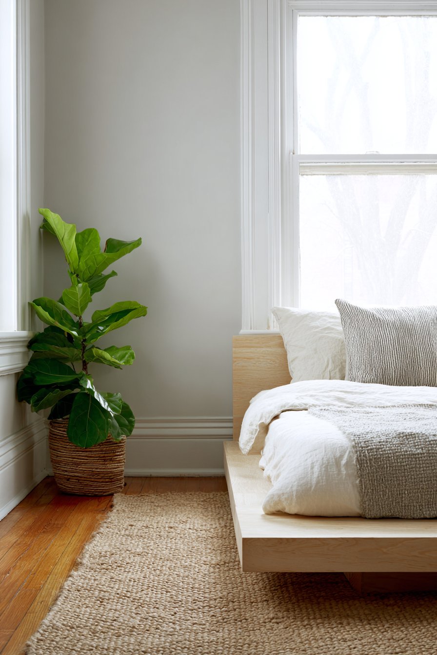 A single potted fiddle leaf fig adds organic life. The plant’s sculptural leaves provide gentle movement and oxygen. A woven jute rug defines the bedside space naturally. Its neutral texture adds warmth without color competition.
