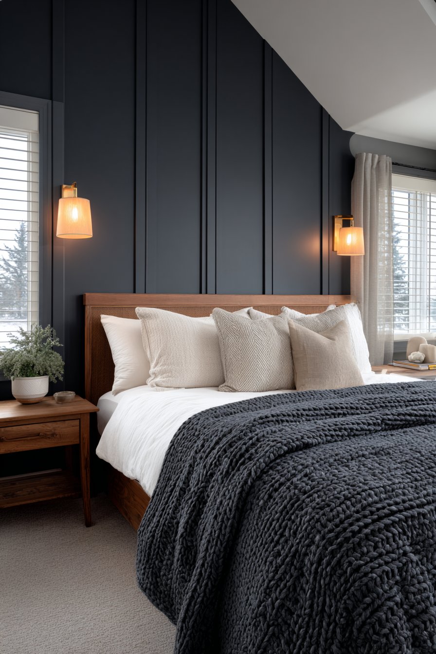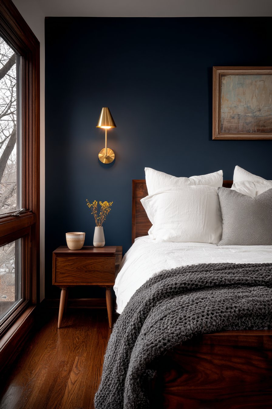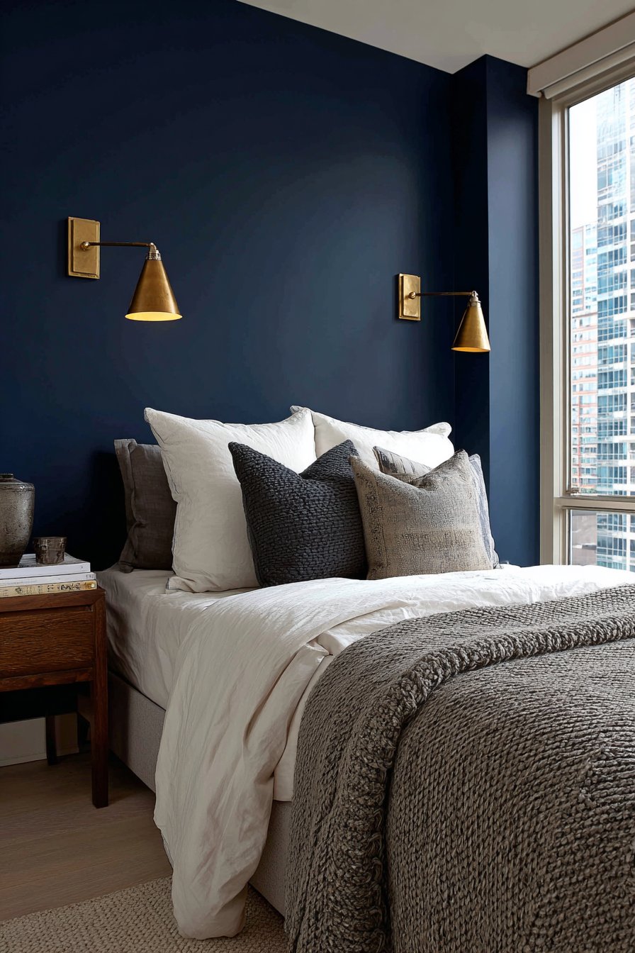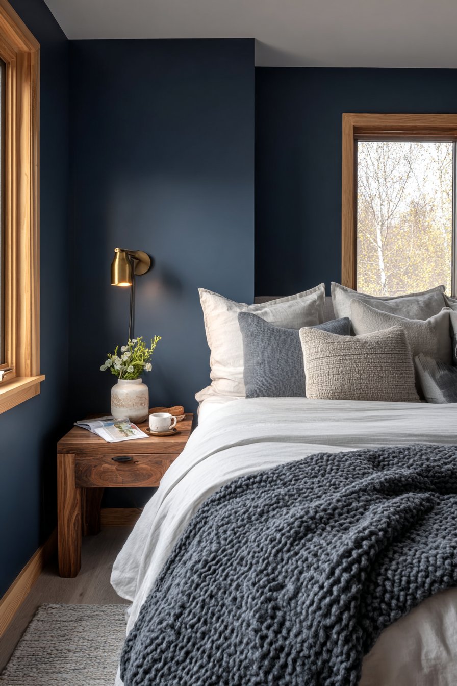 A dramatic navy blue accent wall creates surprising depth. The dark color recedes visually in interesting ways. White linen sheets provide crisp contrast against the moody backdrop. A textured knit blanket in charcoal gray adds dimensional warmth.