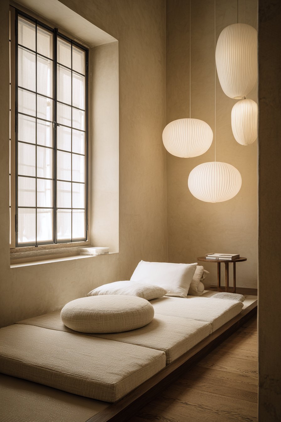 Shoji-inspired paper pendant lights hang at varying heights. They cast soft, diffused illumination throughout the space. The gentle light quality promotes calm and contemplation. A small meditation cushion invites mindful practices.