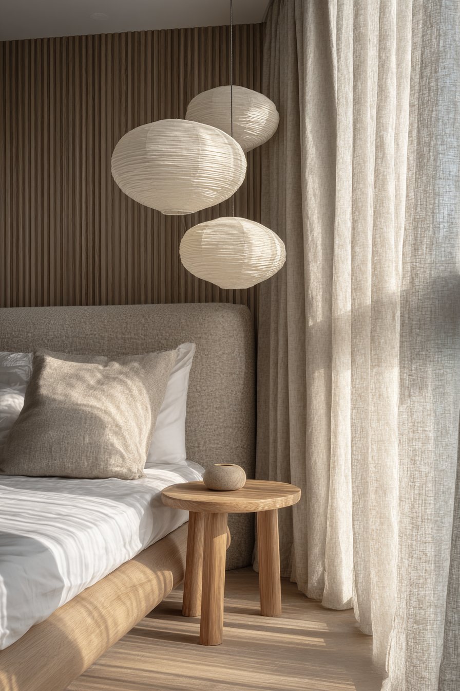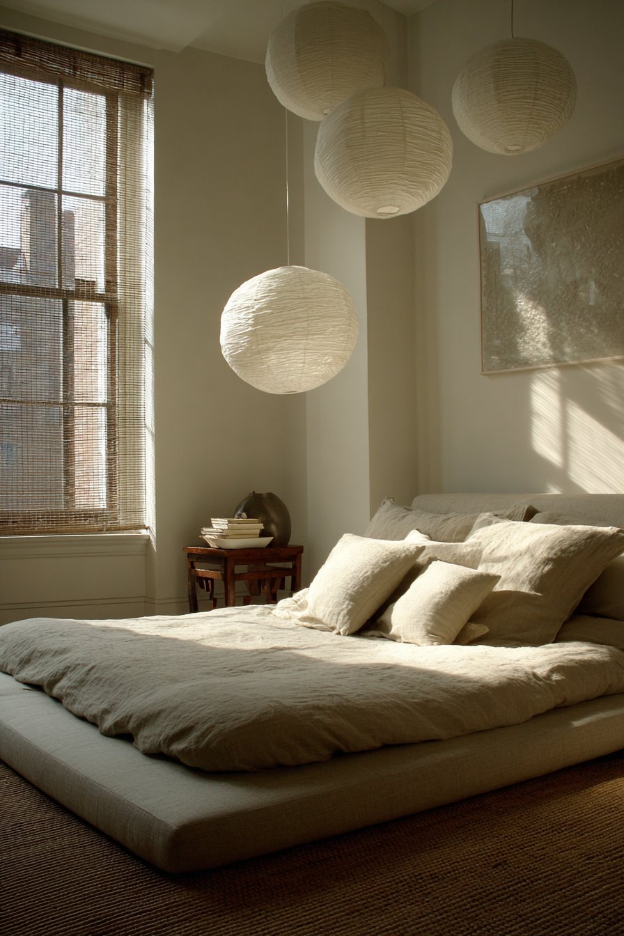 A bamboo side table provides minimal but sufficient surface area. Natural light filters through rice paper window coverings beautifully. The serene atmosphere encourages rest and restoration. Intentional negative space becomes part of the design.