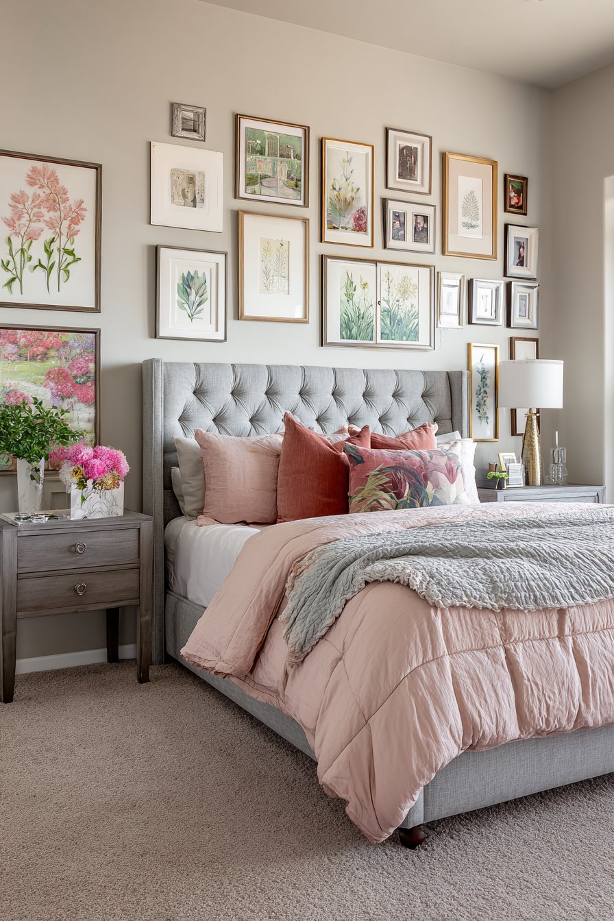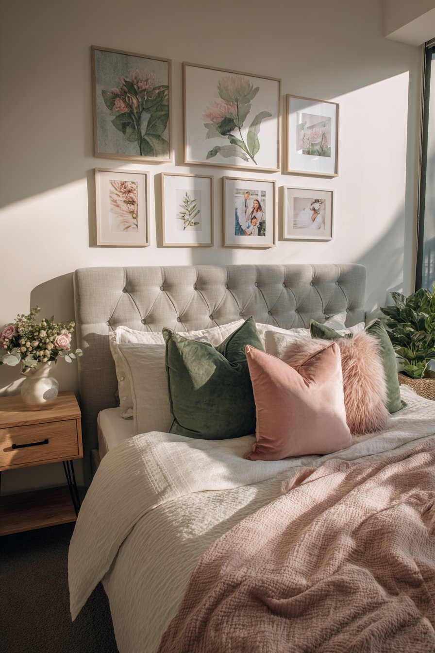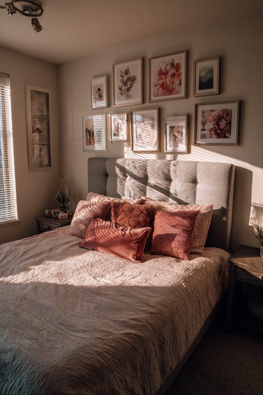 A gallery wall of botanical prints and photographs adds personality. The arrangement sits above the bed without requiring floor space. Varied frames create visual interest through diversity. The curated collection tells a personal story.
