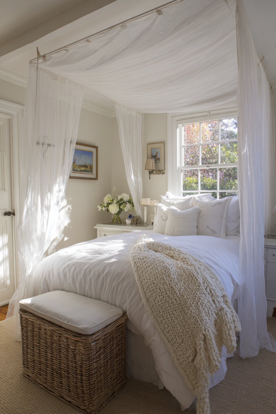 A canopy bed created with sheer white curtains adds romance. The simple ceiling-mounted rail system saves floor space. Translucent fabric defines the sleeping area without visual heaviness. The effect feels dreamy and ethereal.