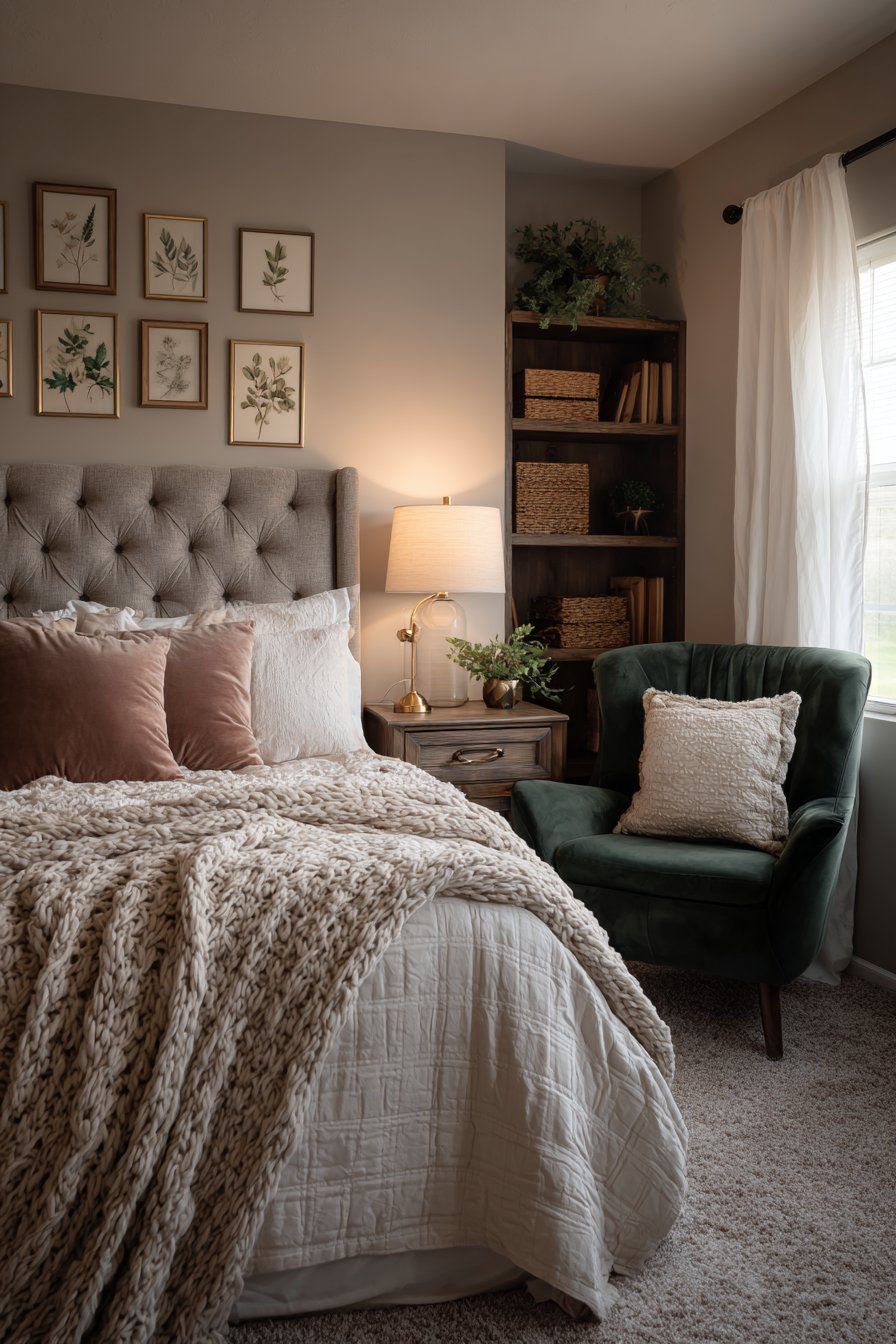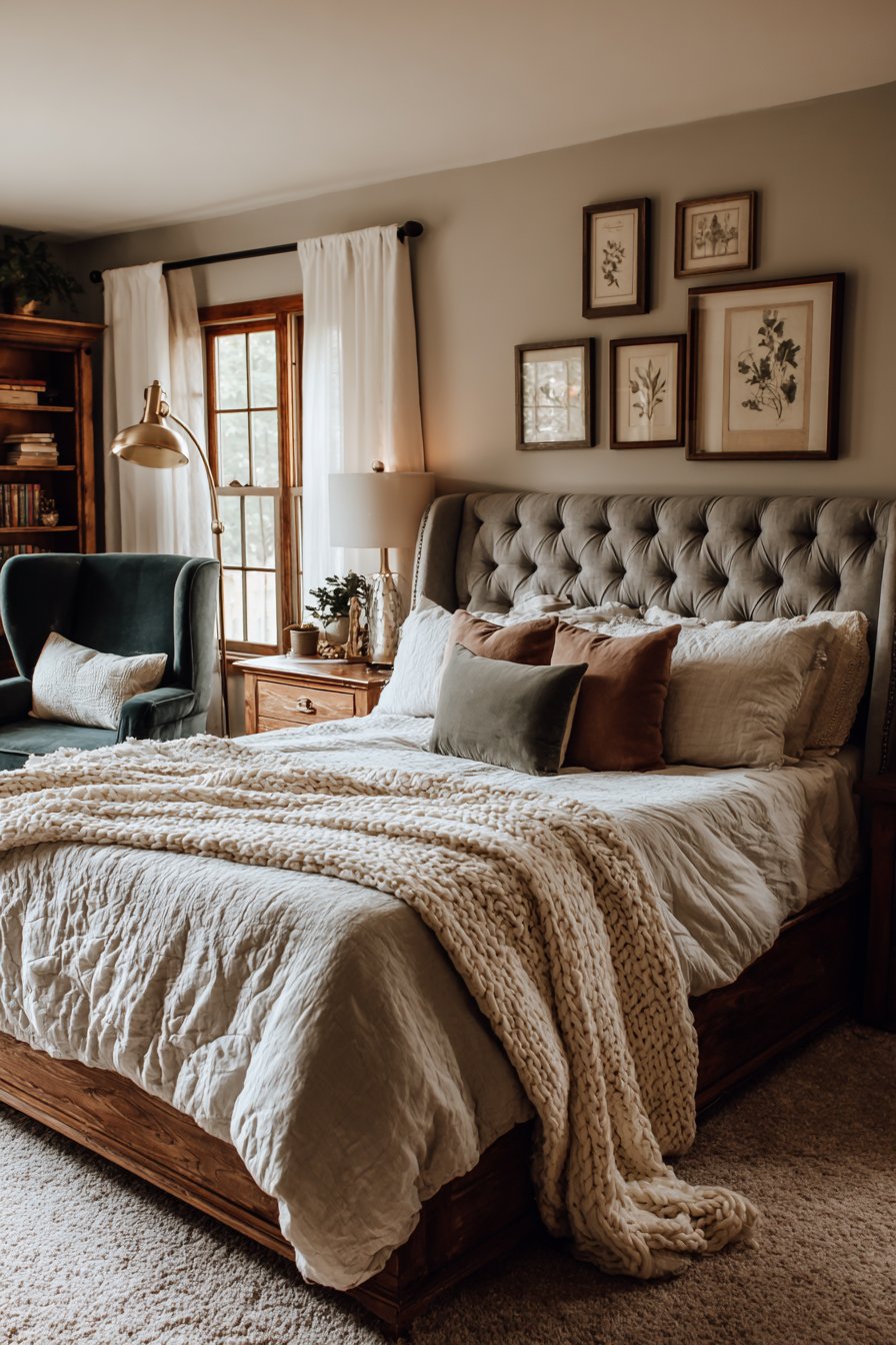 The upholstered headboard in soft gray linen features button tufting. This adds subtle texture and visual depth. Bedding layers include a waffle-weave blanket and velvet pillows. Muted jewel tones provide sophisticated color accents.
