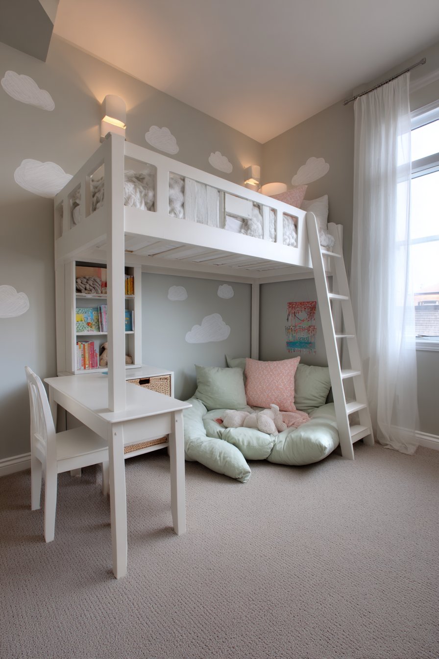 A white wooden loft bed transforms vertical space into functional territory. The integrated ladder features safety rails for secure climbing. Below the elevated sleeping area, a cozy reading nook invites quiet moments. Floor cushions in soft pastels create comfortable seating. A small bookshelf displays children’s books within easy reach.