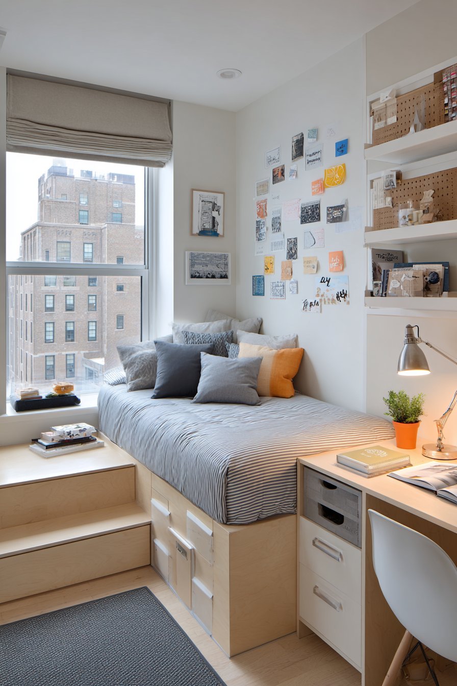 Raised bed platforms with built-in steps maximize vertical organization. The steps double as storage drawers brilliantly. Natural oak finishes provide warmth and durability. Safety rails prevent nighttime falls. Underneath, study areas with wall-mounted desks utilize space.