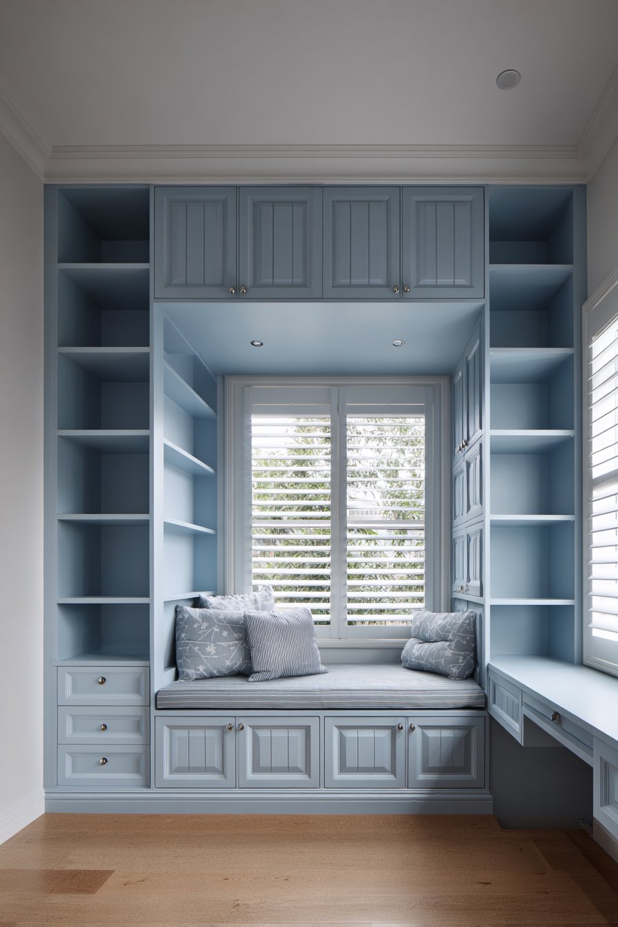 Wall-to-wall built-ins create custom fitted solutions. The bed nook recesses in the center strategically. Soft blue-grey paint unifies the entire system. LED strip lighting above beds provides reading illumination. Open cubbies at various heights organize toys.