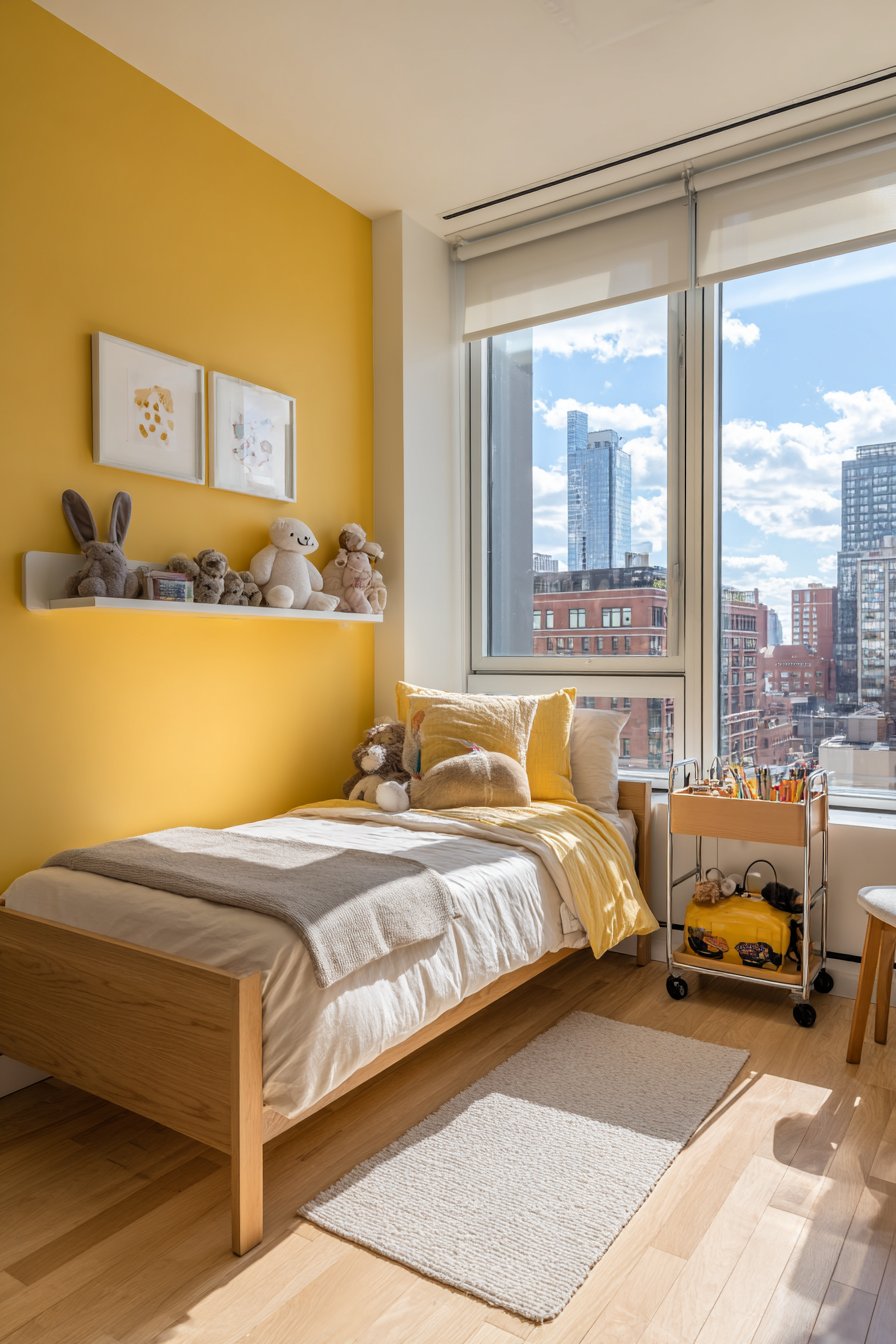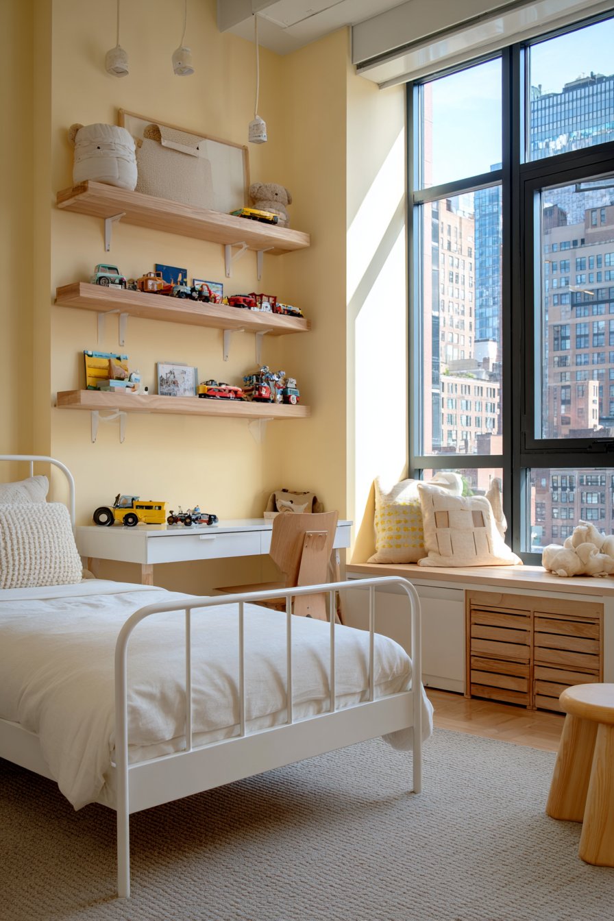 Pale yellow walls create warmth throughout the space. The color reflects available light effectively. A small desk with fold-down chair attaches to walls. The furniture disappears when homework time concludes. Neutral berber carpet in stain-resistant fiber covers floors.