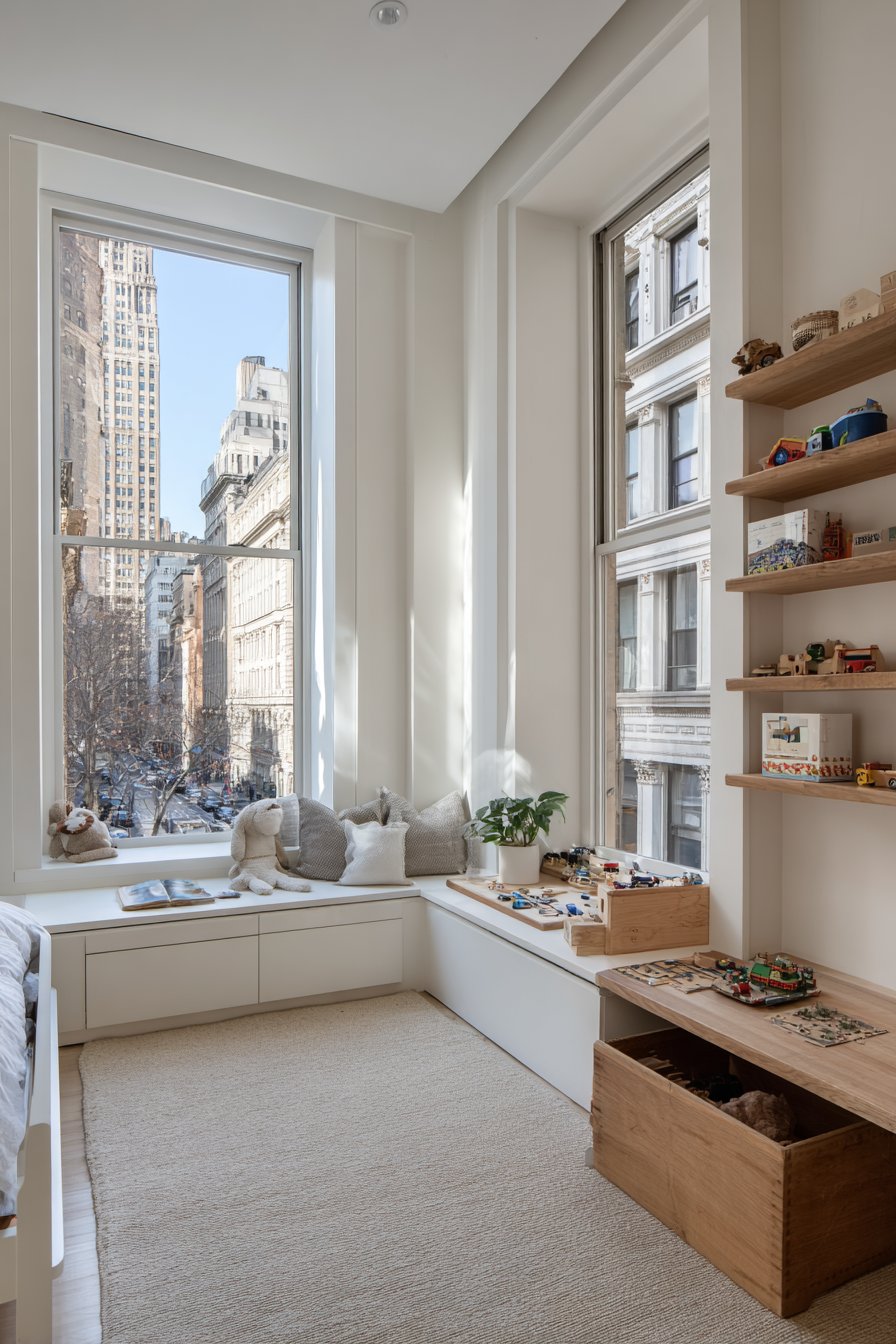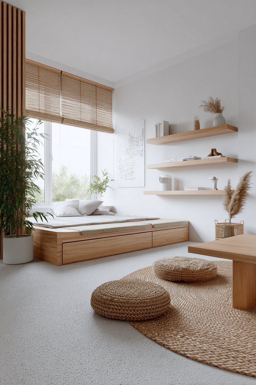 Floating shelves in blonde wood display at staggered heights. Books and small collections arrange attractively. Floor pillow seating areas with low tables enable play. Natural bamboo roller shades filter light gently. The minimalist furniture creates exceptional openness.