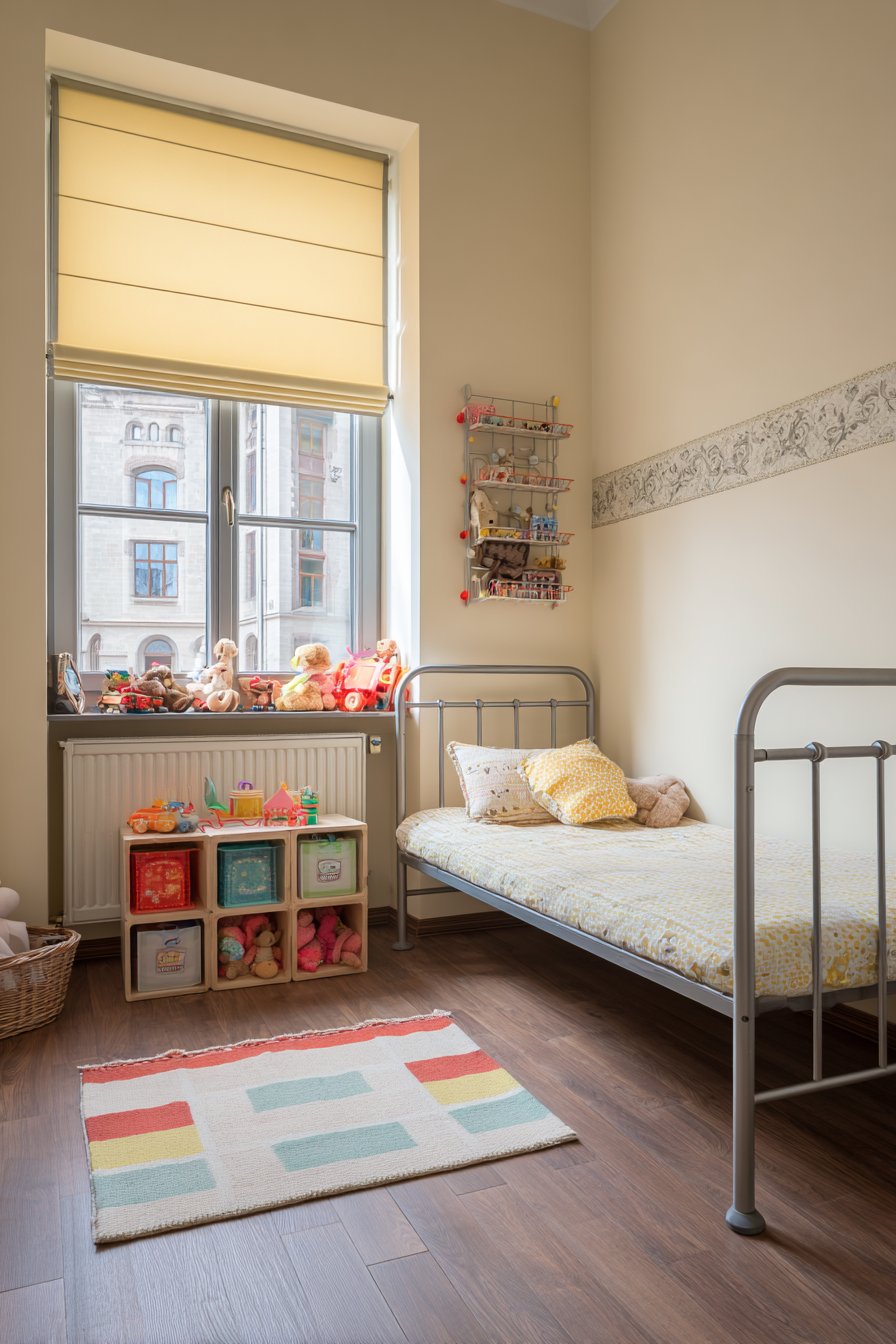 Simple white metal bed frames position strategically along walls. Maximum floor space remains available for active play. A low wooden toy chest features safety hinges. The chest doubles as seating beneath the window. Floating corner shelves display favorite toys without floor interference.