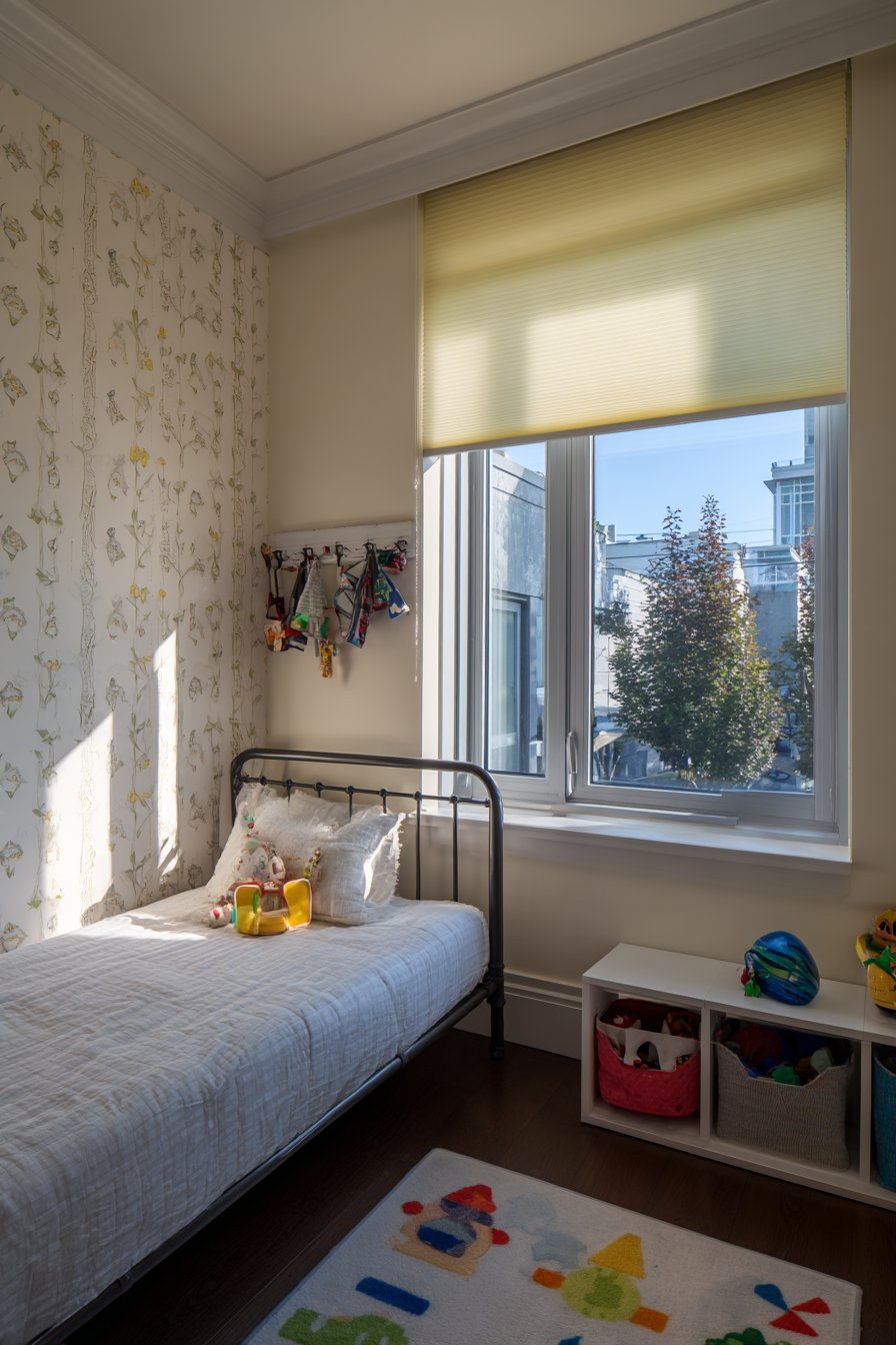 Warm cream walls with decorative border decals add interest. Chair rail height placement creates visual dimension. Cellular honeycomb shades provide insulation and light control. Medium oak hardwood floors offer lasting durability. Small area rugs in primary colors add cheerfulness.