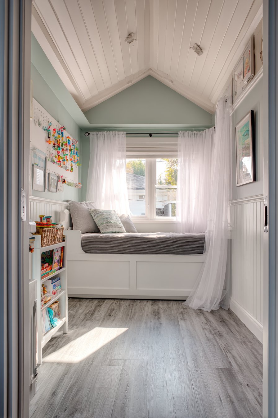 Current favorite toys stay accessible in mobile storage. Soft aqua walls with white wainscoting add dimension. Luxury vinyl tile flooring provides easy maintenance. Sheer white curtains on tension rods maximize natural light. The multifunctional approach solves multiple challenges simultaneously.