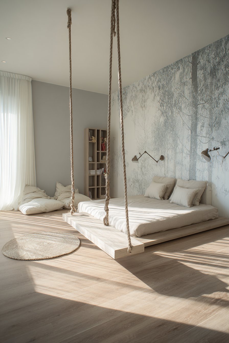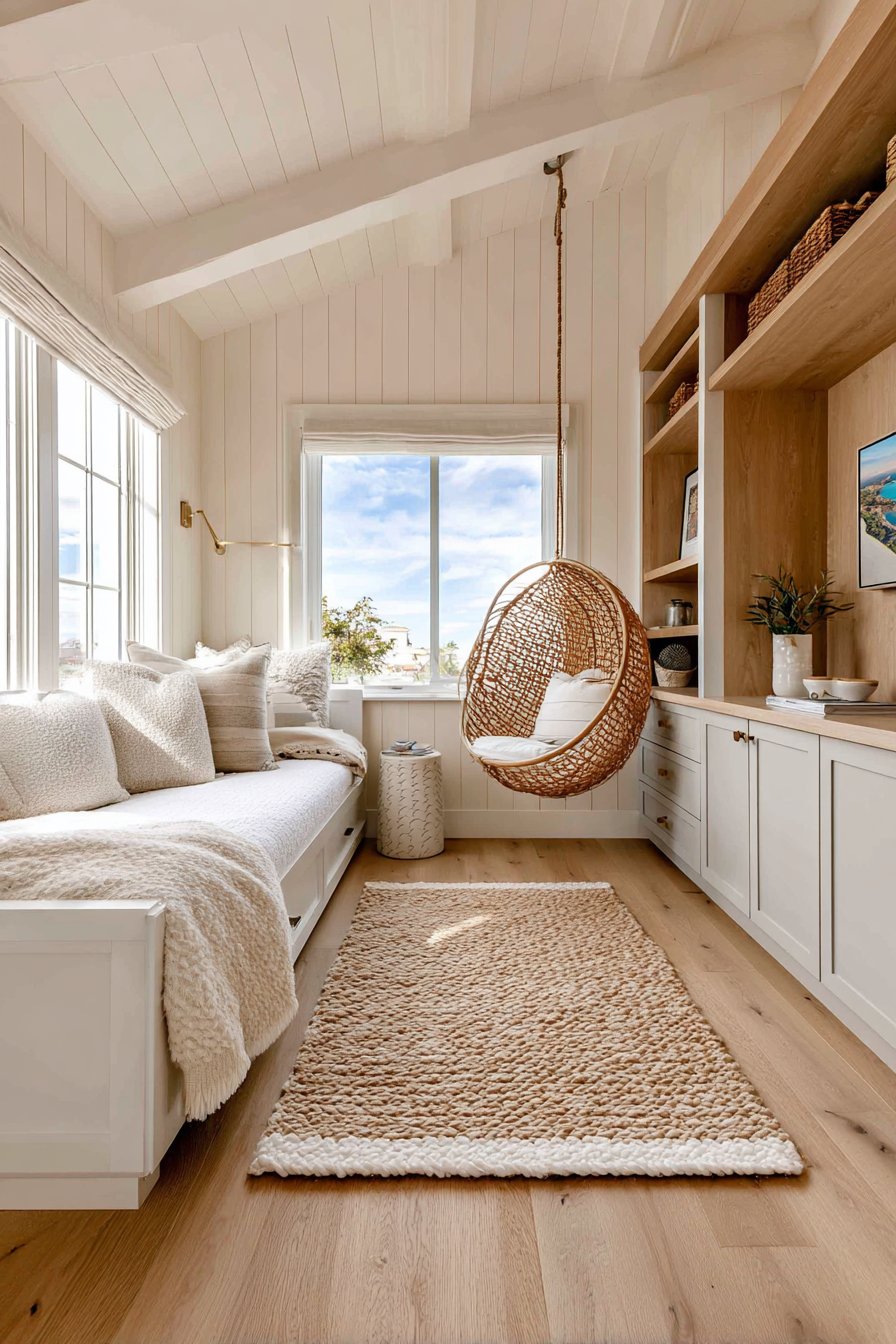 A small hanging chair suspends from ceiling joists. The chair provides cozy reading spots. Soft peach walls with white wainscoting add character. The architectural detail doesn’t overwhelm small dimensions. Hardwood flooring in light maple adds natural beauty.