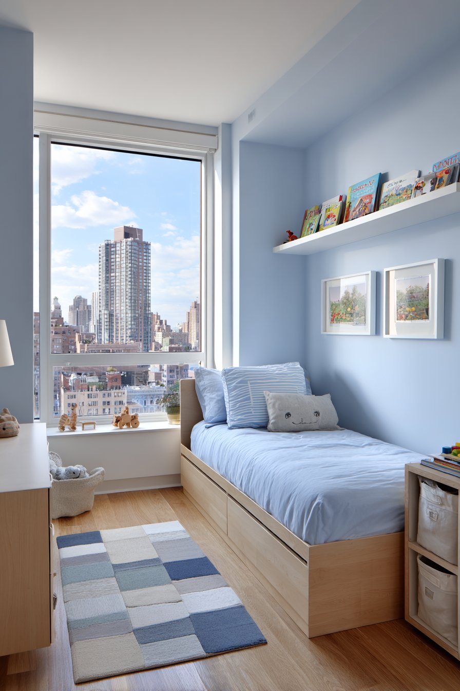 Pale blue accent walls create focal points in this practical design. A twin bed features built-in drawers underneath for clothing storage. The integrated storage eliminates the need for separate dressers. Above the bed, a narrow floating shelf displays small toys. Picture books sit within easy reach for bedtime reading.