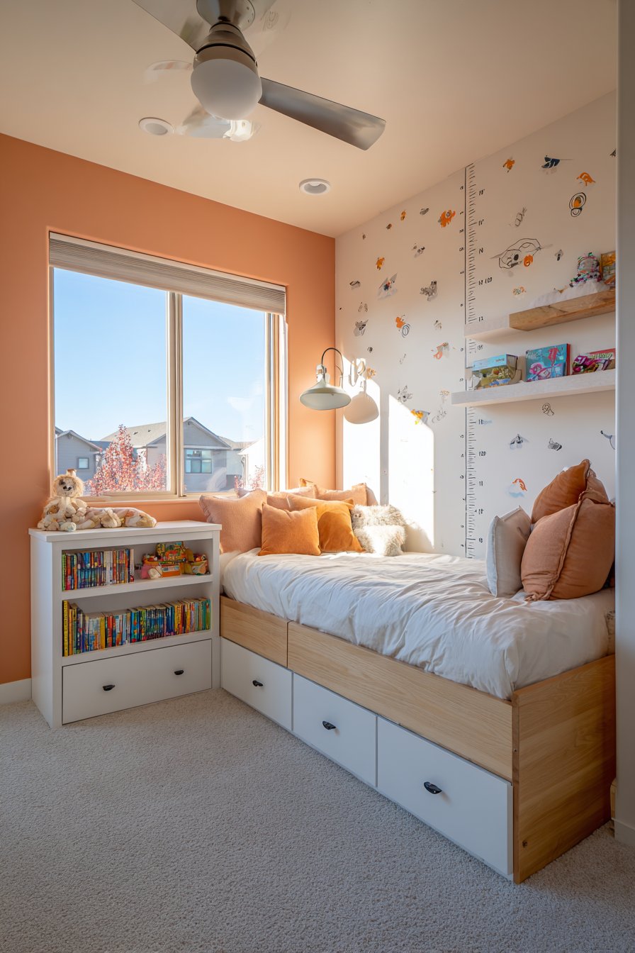 Growth chart decals and small floating shelves utilize remaining walls. Soft peach walls with white trim create warmth. Ceiling fans with lights provide circulation and illumination. Light grey carpeting offers softness and durability. Morning light from windows highlights built-in solutions.
