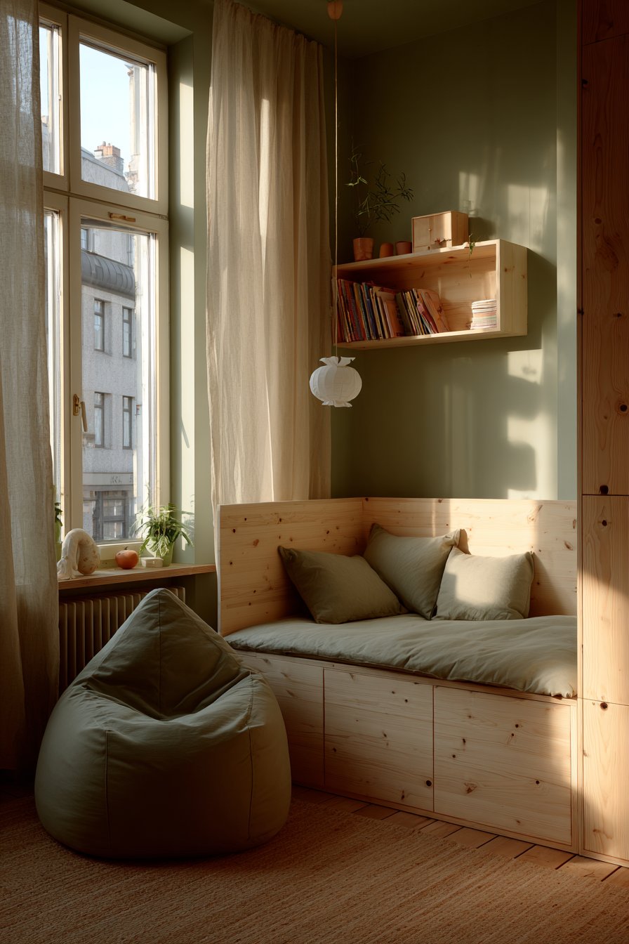 Multifunctional furniture solves multiple space challenges simultaneously. The daybed serves as seating during daytime hours. Night visitors receive comfortable accommodations. Natural lighting emphasizes careful planning. The room demonstrates that versatility matters in small spaces.